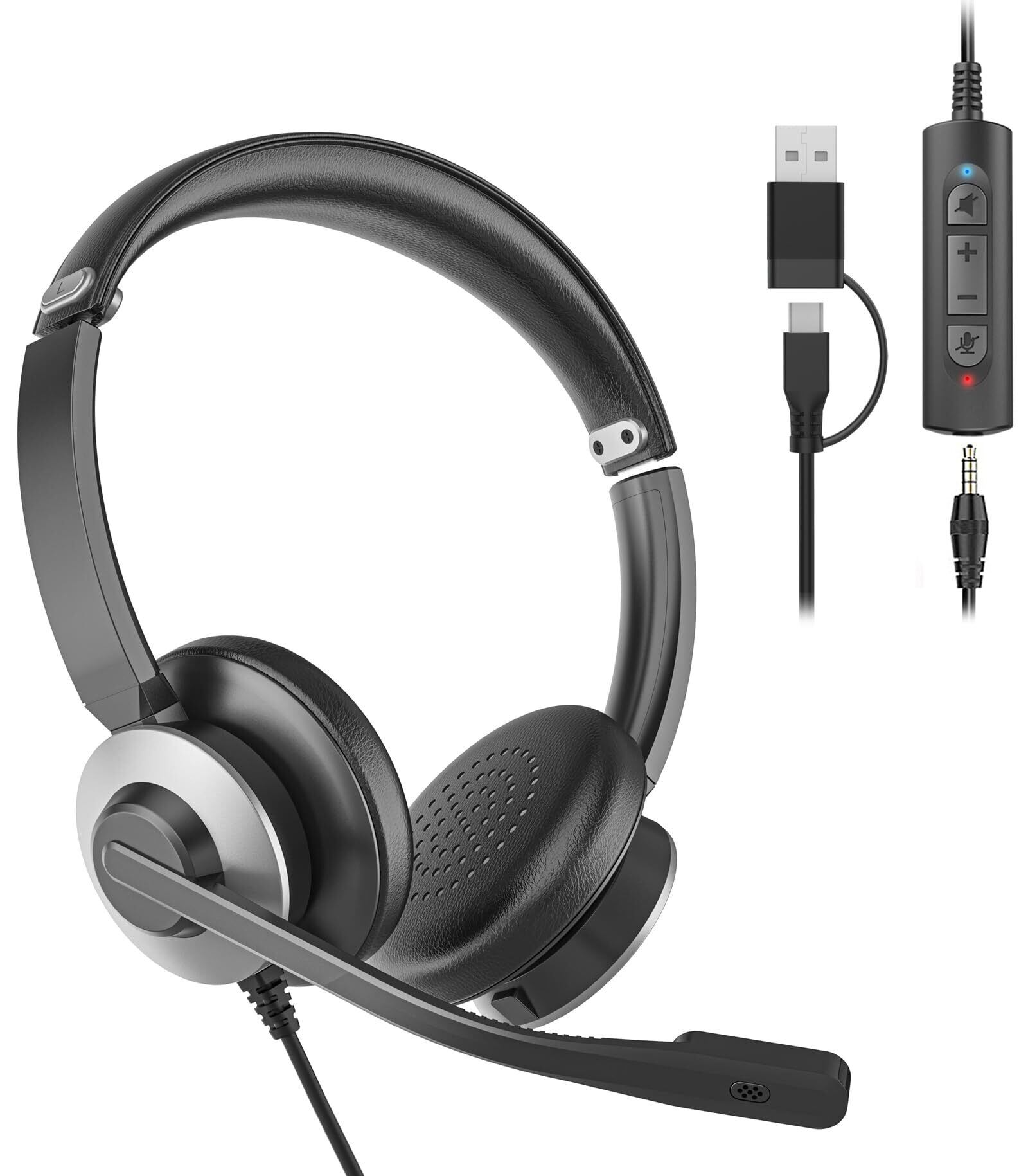 ヘッドセット 有線 マイク付きイヤホン 3.5mm/USB-A/USB-C対応 ノイズキャンセリング搭載 ステレオ音声 音量調節・ミュート機能付き 軽量で快適 オンライン会議/テレワーク/仕事用 ブラックグレー