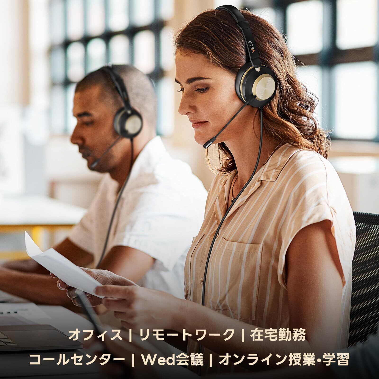 「『Wantek アップグレードヘッドセット』は、あらゆるビジネスシーンや学習環境に最適な製品です!新型ノイズキャンセリングマイクが、外部の音を効果的に遮断し、クリアで明瞭な音声を提供します。品質にこだわった設計で、長時間の使用でも快適です。」