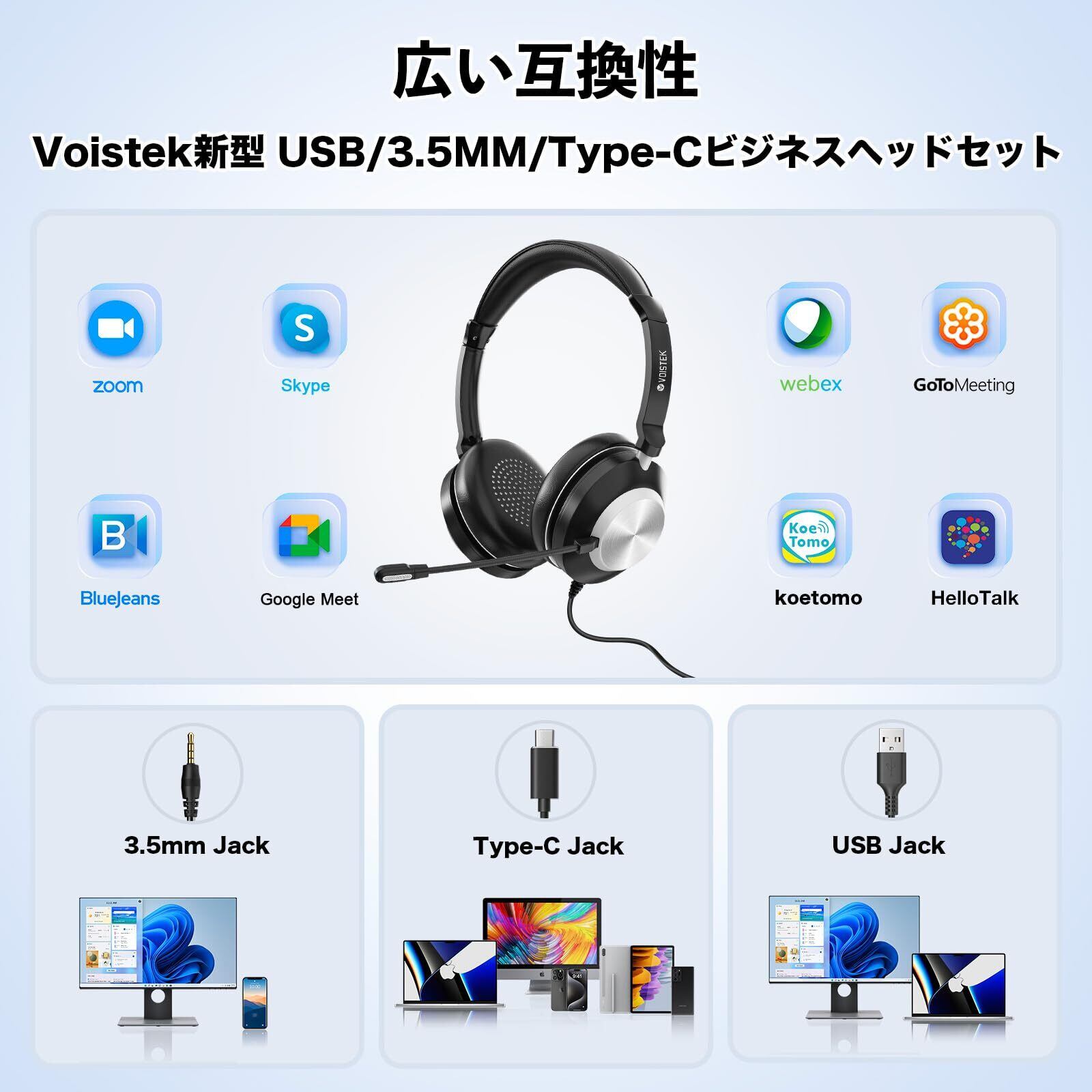 【幅広い機器互換性を備えた USB/TypeC/3.5mm ヘッドセット】 このアップグレード版のヘッドセットは、USB と 3.5mm の有線接続を搭載しています。PC やノートパソコン、スマホ、タブレットなど、さまざまな機器に対応しています。ウェブ会議やテレワーク、オンラインビジネスコミュニケーション、コールセンター業務、在宅勤務、オンライン授業や学習など、様々なシーンでのニーズに対応できます。