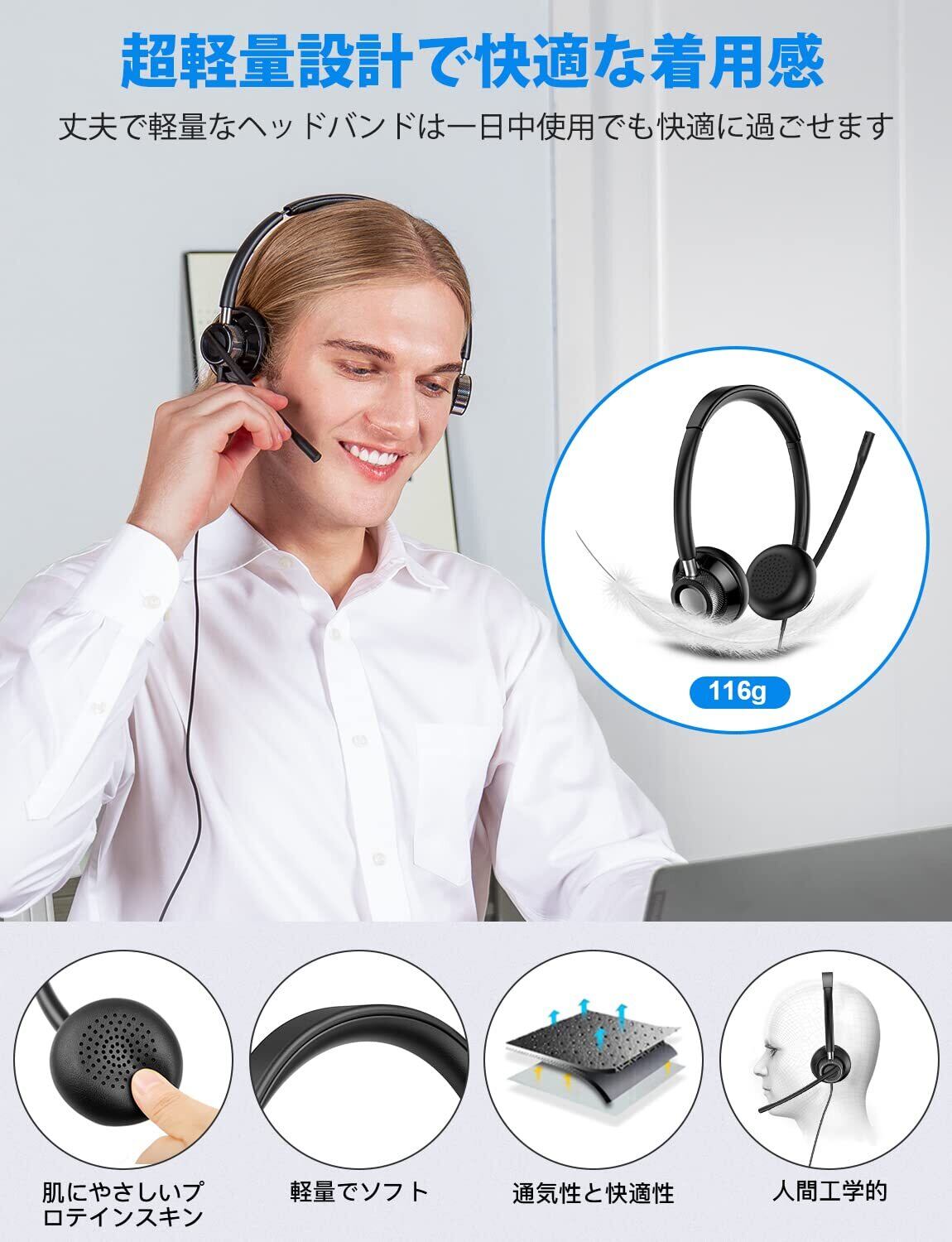 【軽量で快適な装着感】pc マイク付きイヤホン 長さ調整可能なヘッドバンドお頭にフィットします。高密度スポンジイヤーパッドの柔軟性が高くて長時間使用しても疲れにくい。ヘッドセット usb 超軽量で安定した装着感あるの両耳ヘッドバンド式ヘッドセットで一日中装着でも疲れにくいオーバーヘッドタイプです。マイク付きヘッドセット またお肌にやさしいタンパク皮革で包まれ、柔らかくて気持ちよく通気性がいいです。ケーブルは絡まりにくく、耐久性にも優れているファブリックコードを採用しています。