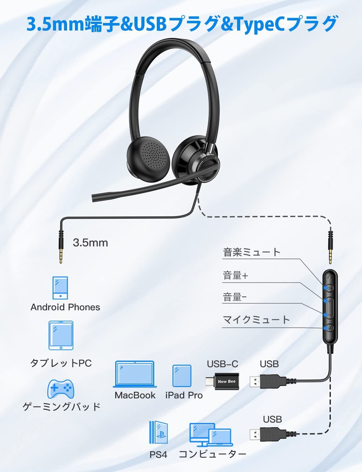 「3.5mmジャックに加え、USB-AおよびUSB-C接続にも対応しているため、PC、Mac、スマートフォンなど多様なデバイスに簡単に接続できます。プラグ&プレイ方式なので、面倒な設定は一切不要です!」