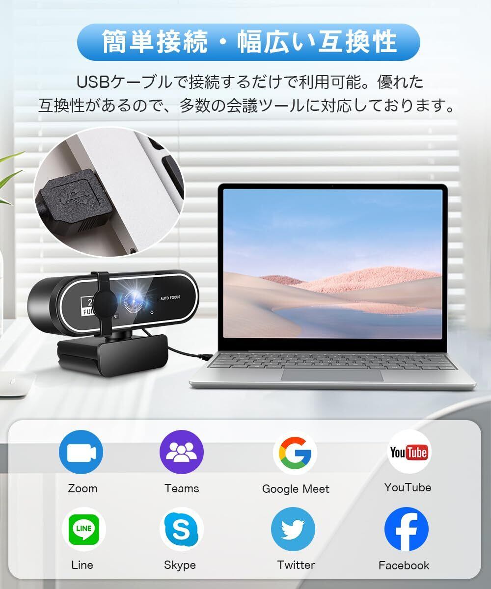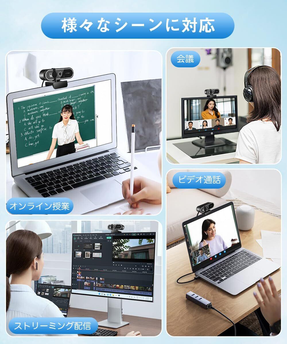 「『Webカメラ ウェブカメラ HD 2K』はZoom、Skype、YouTubeなど、多彩なプラットフォームに対応し、ビデオ会議、オンライン授業、趣味の配信など、様々なシーンで力を発揮します。USB接続なので、簡単に使用開始できます。」