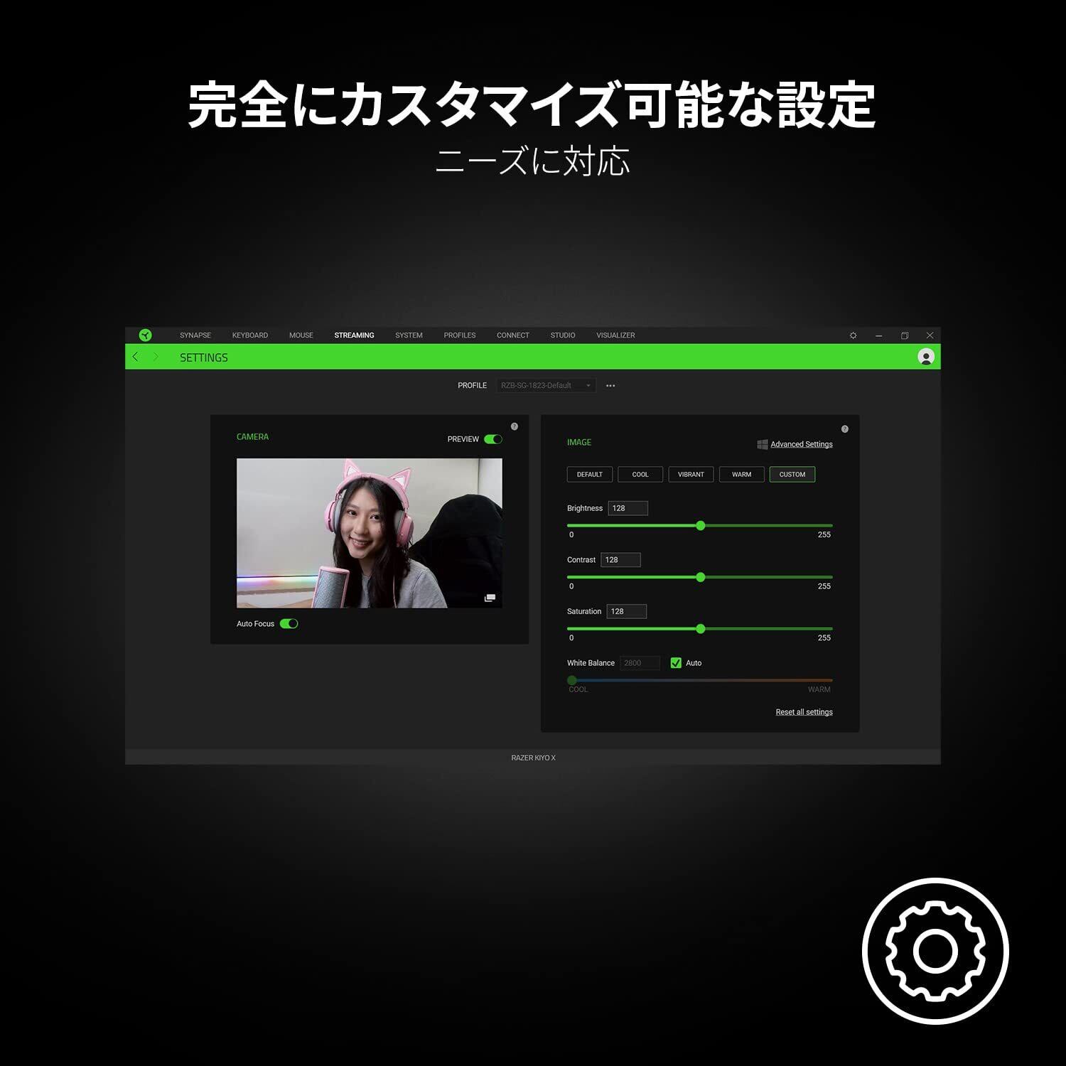 「『Razer Kiyo X ストリーミング ウェブカメラ』は、オンラインストリーミングやビデオ通話のクオリティを大幅に向上させる高性能カメラです!フルHD 1080pでの30FPSと720pでの60fpsに対応し、滑らかで臨場感あふれる映像を提供します。」