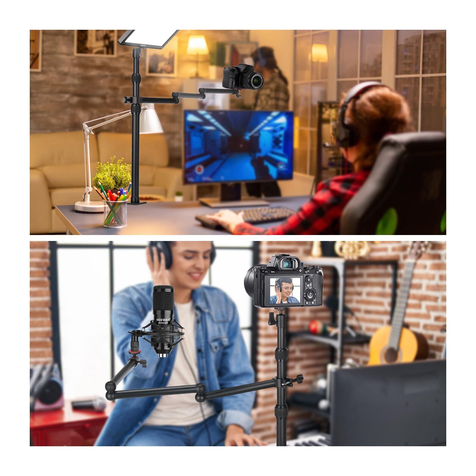 【多彩なカメラアーム卓上スタンド】NEEWER TL253A+MH022 卓上スタンドキットは理想的な生放送ソリューションで、ビデオ録画、生放送、ビデオ会議、ポッドキャスティング、ゲームに最適です。DSLR/ミラーレスカメラ、LEDビデオライト、マイク、ウェブカメラを連携して、ストリーマーデスクを小型個人スタジオに変えることができます。