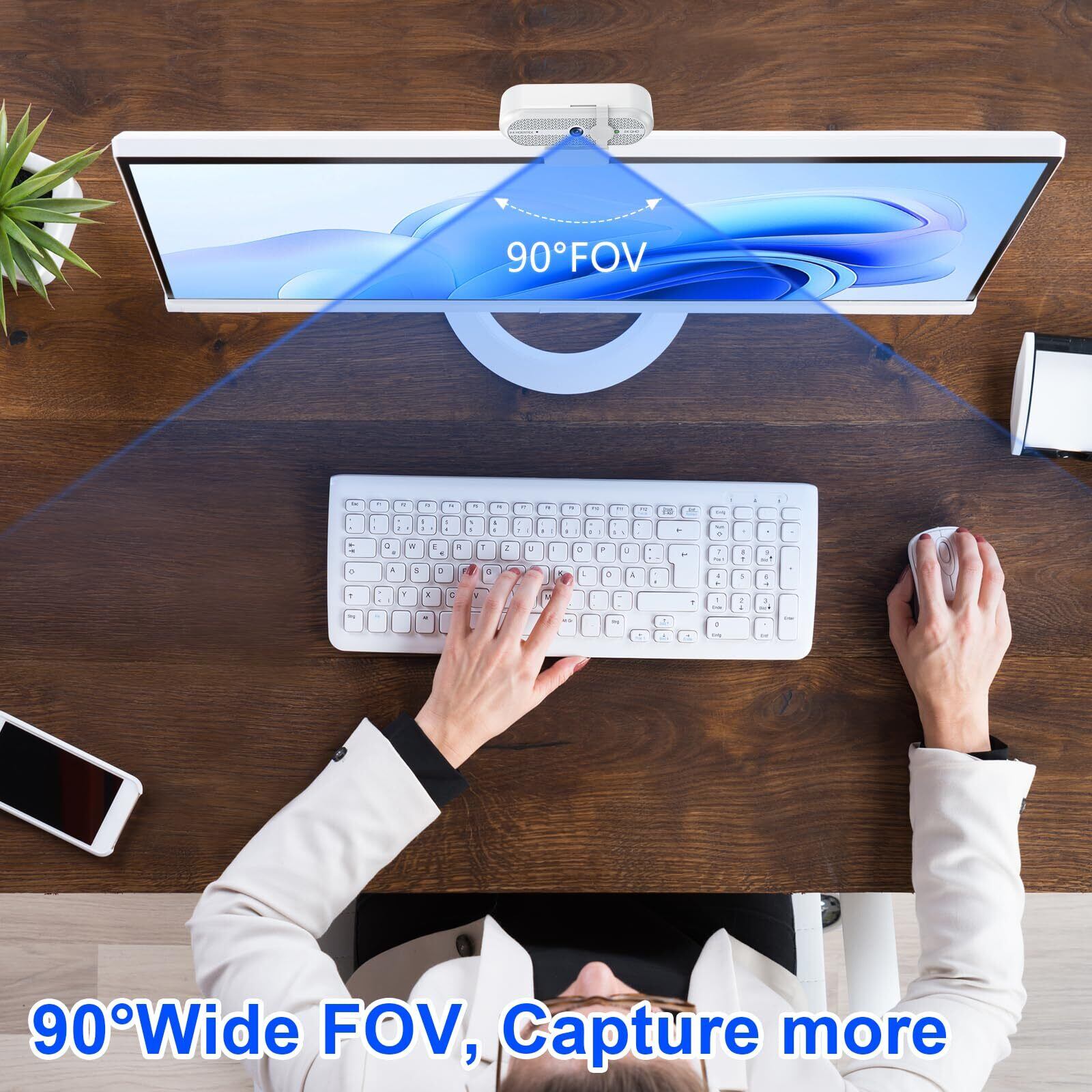 「90°の広視野角により、複数人を一度に映すことができます。チームミーティングや家族とのグループビデオ通話に最適で、全員がしっかりフレームに収まります。」