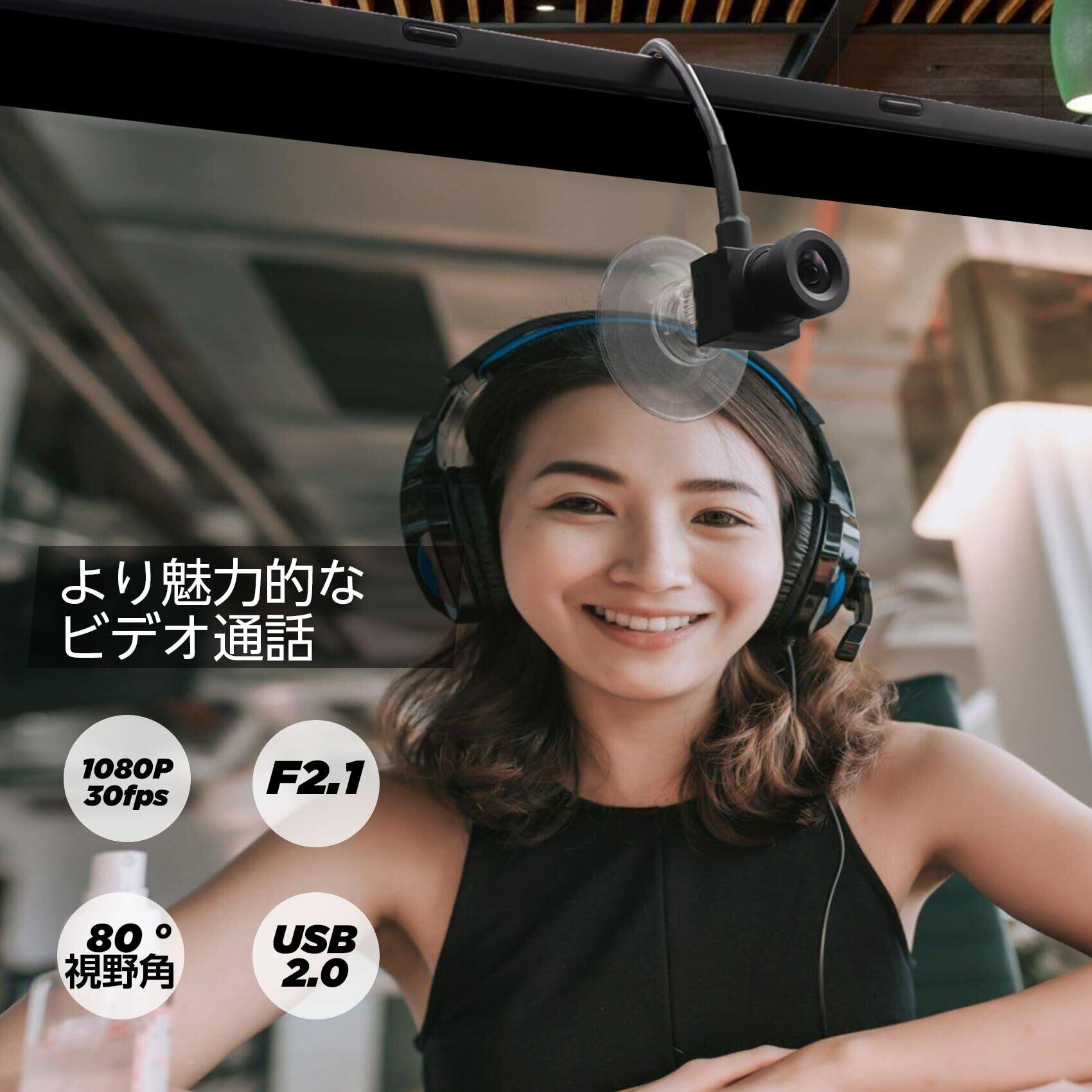 WEBカメラ ウェブカメラ HD1080P 80°広角目線が合う 小型 中央画面に固定された吸盤付き 200万画素 パソコンカメラ skype、Zoom会議用PCカメラ 内蔵マイク
