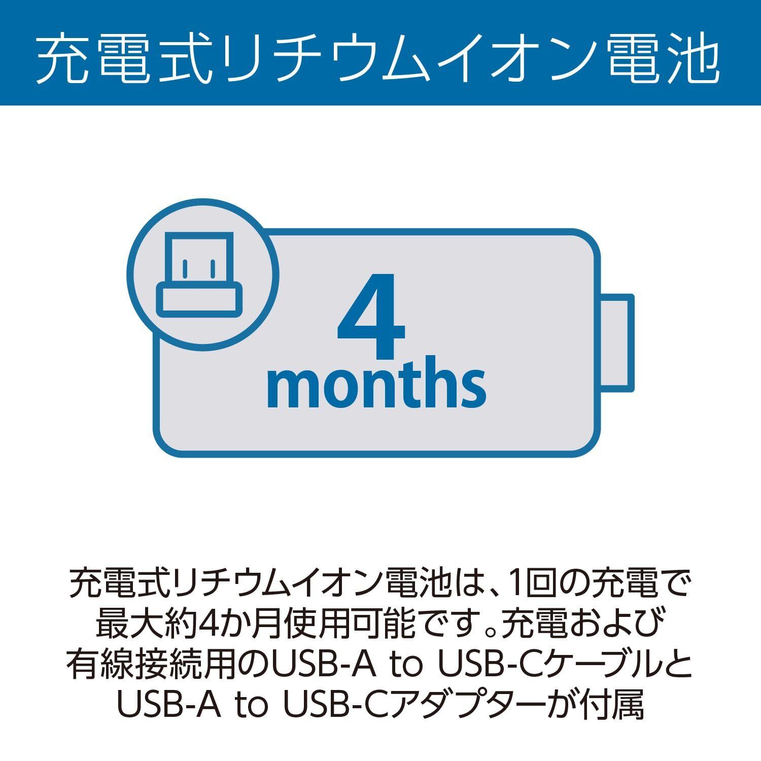 充電可能な付属バッテリー:付属のワイヤーでUSB-C接続するだけでバッテリーの充電可能。およそ4カ月のバッテリー寿命分充電できます。