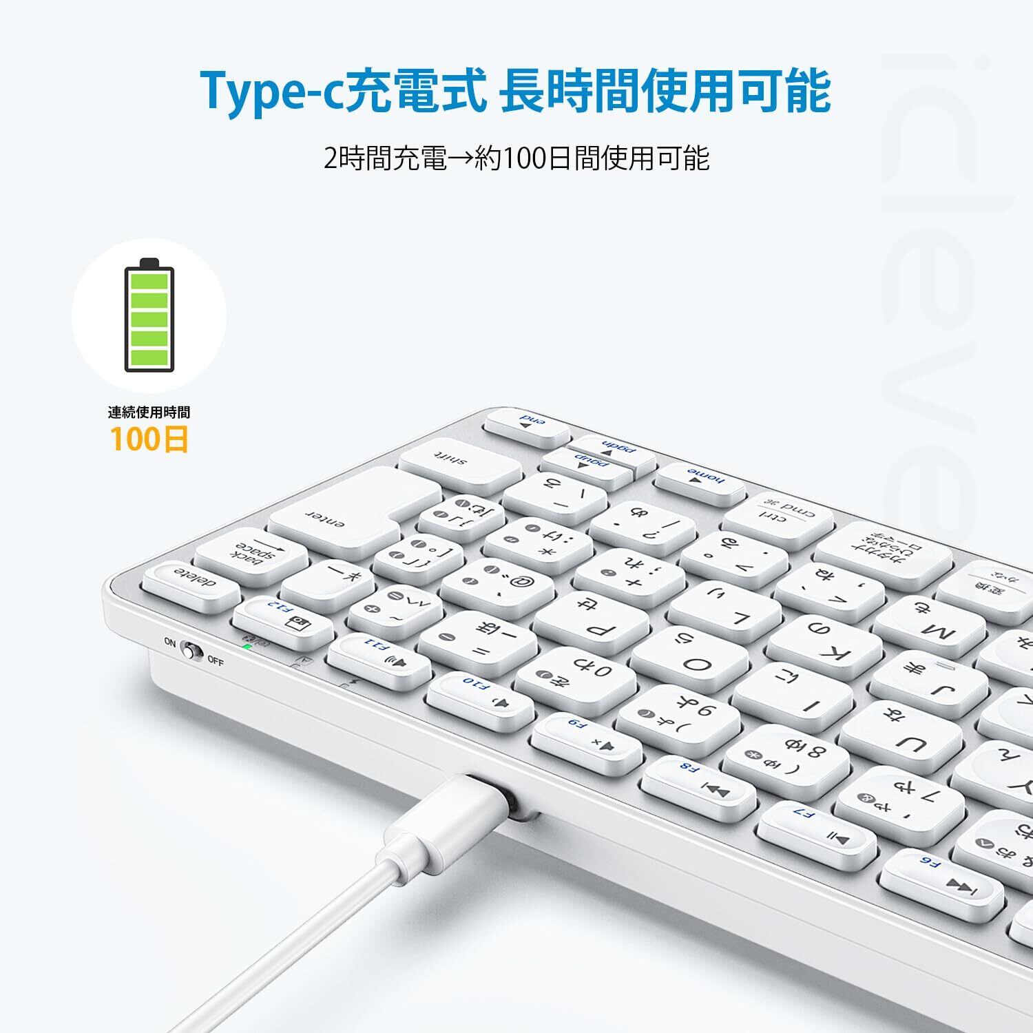 キーボードの説明 プラグアンドプレイ、JIS日本語配列、パンタグラフ式、コンパクトサイズ、Type-C充電式、テンキーレス
