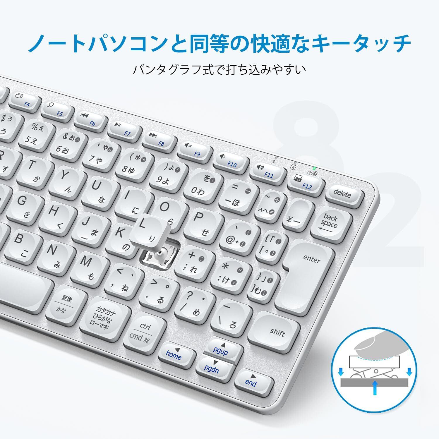 【日本語JIS配列&幅広い互換性】標準のキーキャップサイズは15mm、キー間隔は4mm、キーピッチは19mmで、標準的な日本語配列を採用した82キーの打ちやすいBluetoothキーボードで、快適なタイピング体験を提供します。また幅広い互換性があり、Windows 7/8/10/11、Mac、iOS、Androird、Chrome OS と互換性があります。※一部非対応のデバイスや使用方法があります。