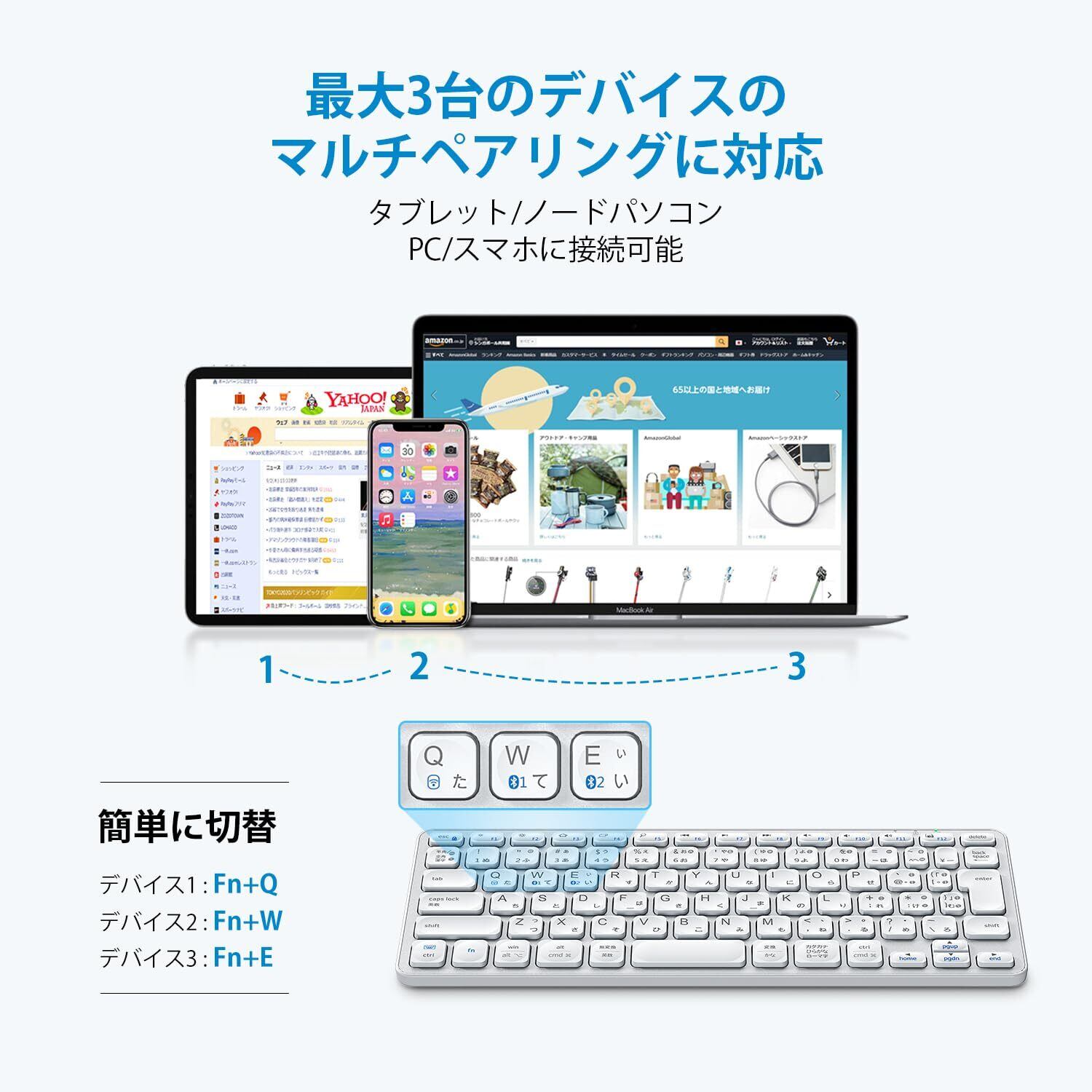 「このキーボードは、最大三つのデバイスを同時に接続し、簡単に切り替えが可能です。Bluetooth接続と2.4GHzワイヤレスに対応しているため、パソコンやタブレット、スマートフォンなど、多様なデバイスで快適に使用できます。」