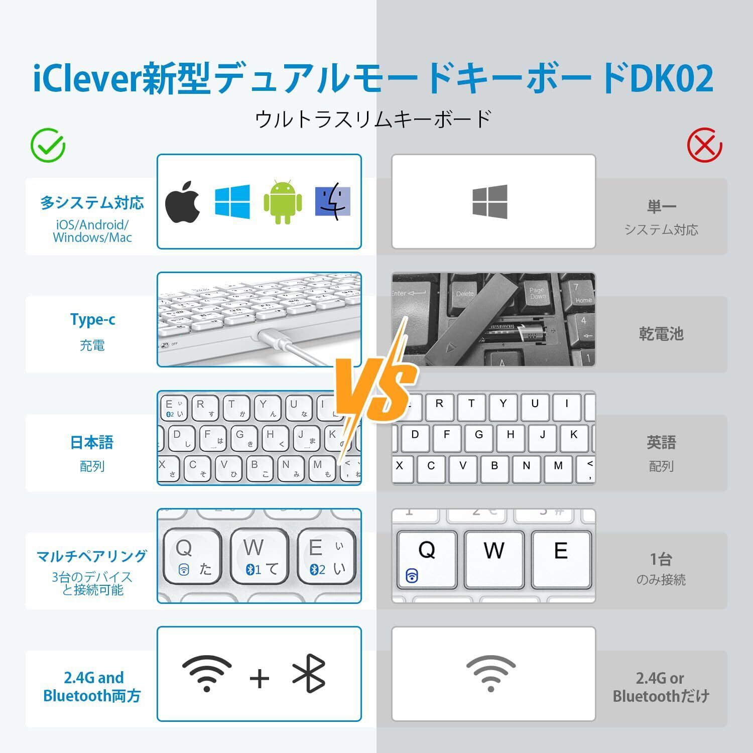 iClever キーボード Bluetooth キーボード 無線 ワイヤレスキーボード2.4Ghz静音キーボード(レシーバー付属) コンパクトキーボード 薄型 小型 デュアルモード Type-C充電式 JIS基準 日本語配列 軽量 三つデバイス自由に切替え 持ち運び パソコン iPad用 Windows Mac iOS Android対応 日本語説明書 シルバーホワイト 白 DK02