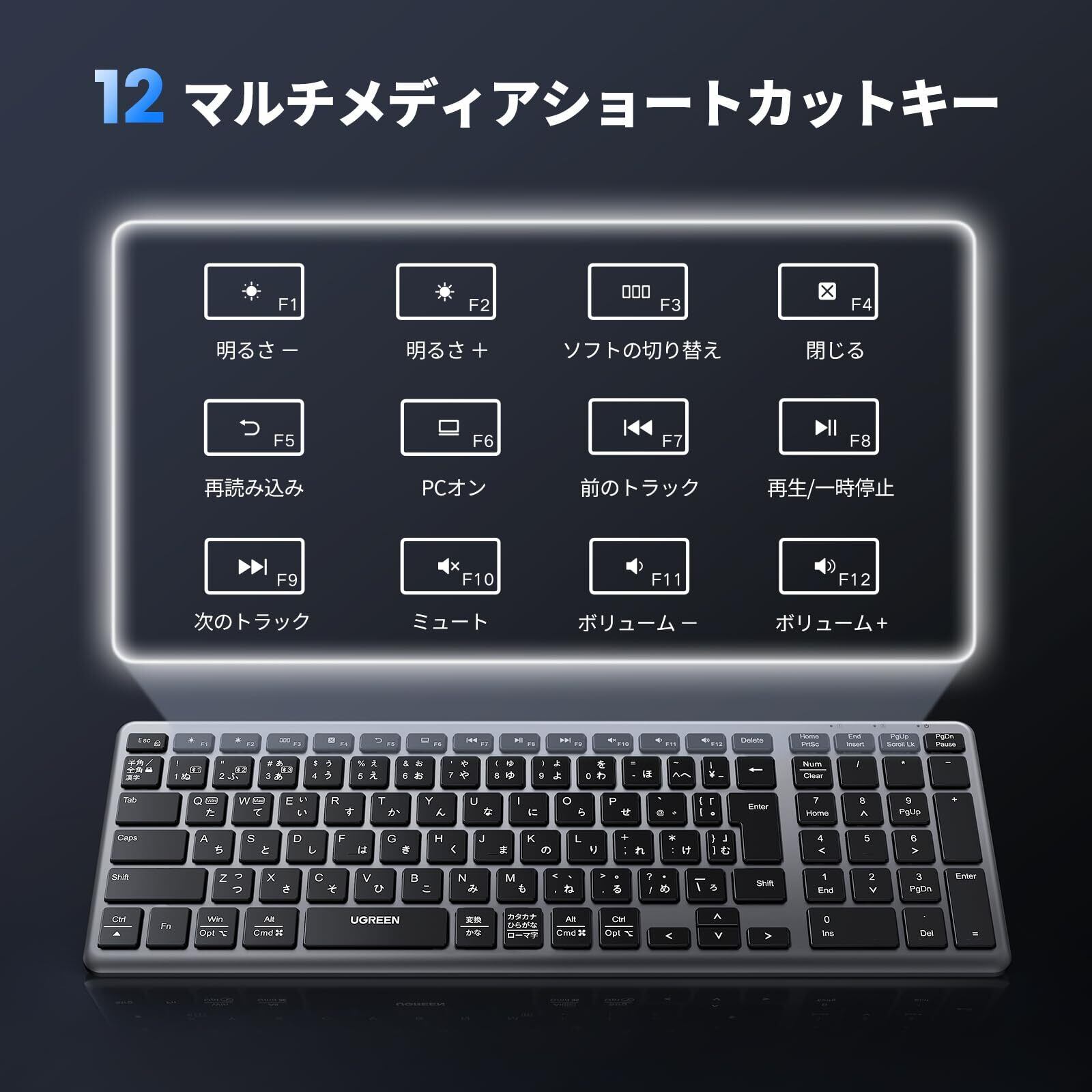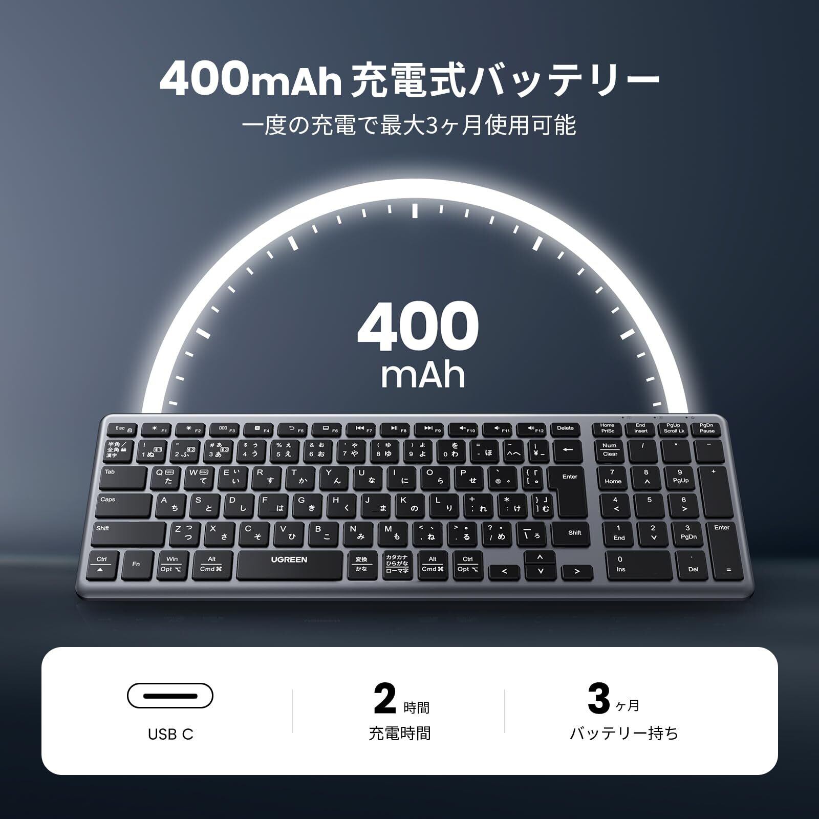 UGREEN ワイヤレスキーボード Bluetooth&2.4G USB-C充電式 無線 薄型 日本語配列 JISキーボード