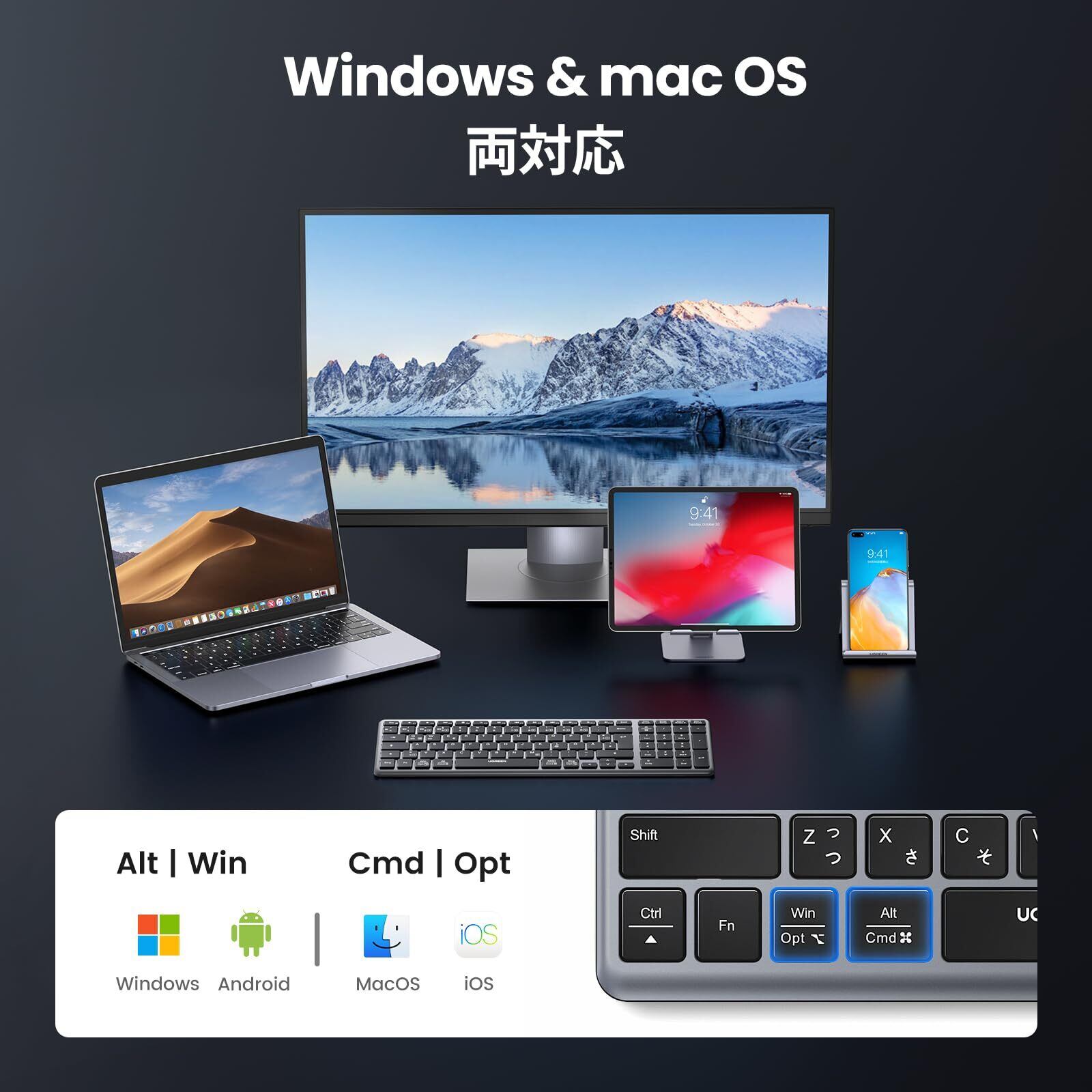 「『UGREEN ワイヤレスキーボード』は、スタイリッシュで高機能な薄型キーボードです!Bluetoothと2.4Gの無線接続に対応し、ご自宅やオフィスでの快適なタイピング体験を提供します。」