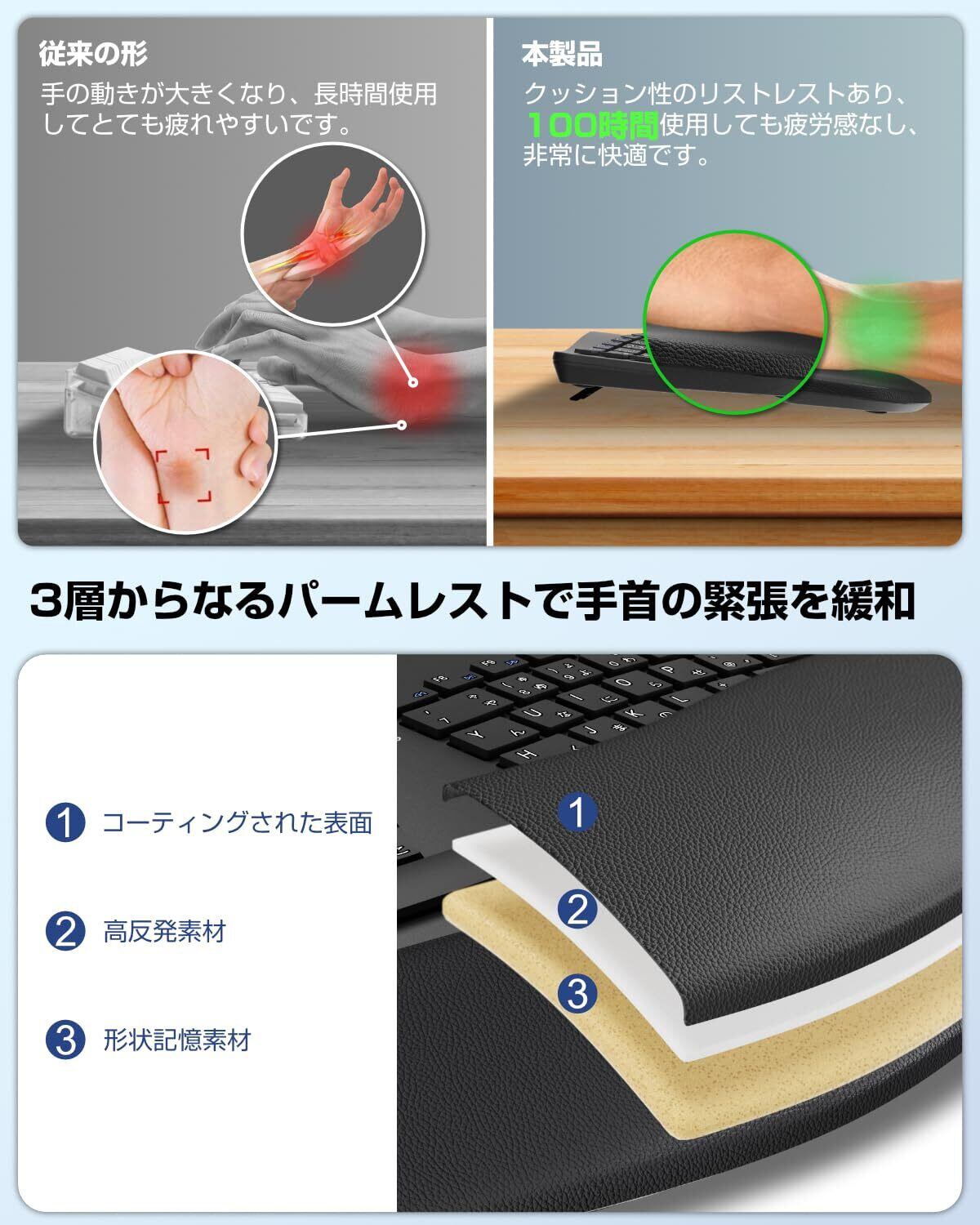 【3層パームレストでさらなる快適さ】Ewin Bluetoothキーボードは表面コーティング、高反発材、形状記憶素材の3層構造が手首をしっかりサポート。従来比57%高いクッション性で、緊張を和らげタイピングをより快適にします。