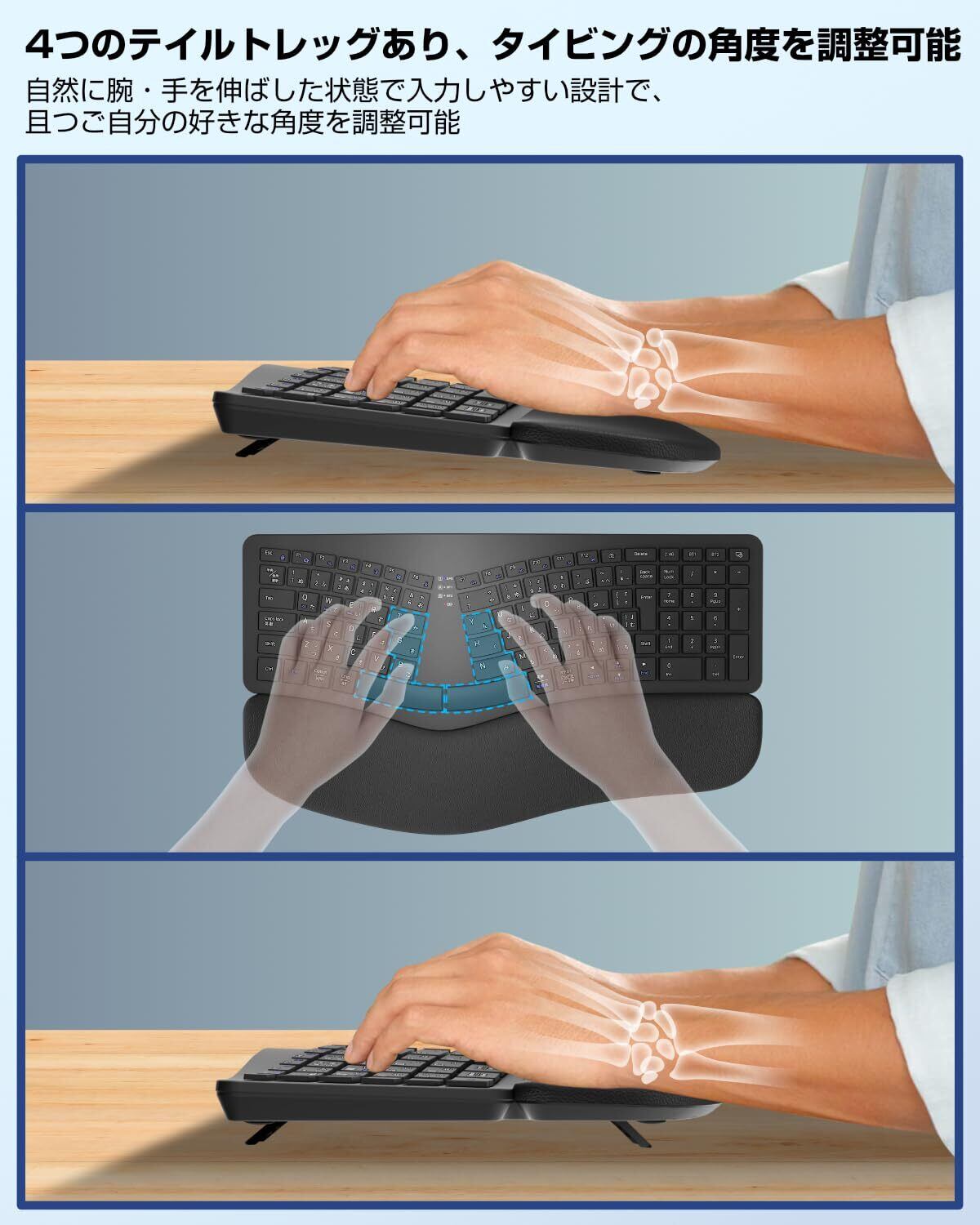 「『Ewin エルゴノミクス キーボード』は、快適なタイピングを実現するための理想的な選択肢です!人間工学に基づいた左右分離型のデザインにより、肩や手首の負担を軽減し、長時間の作業でも疲れにくい設計となっています。」