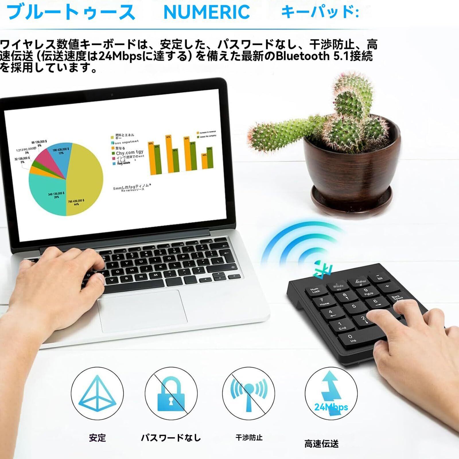 「『テンキー2.4G ワイヤレステンキー』は、タイピングの効率を劇的に向上させるために設計されたスタイリッシュな数字キーボードです!薄型デザインで、持ち運びにも便利。どんなデスク環境にもフィットします。」