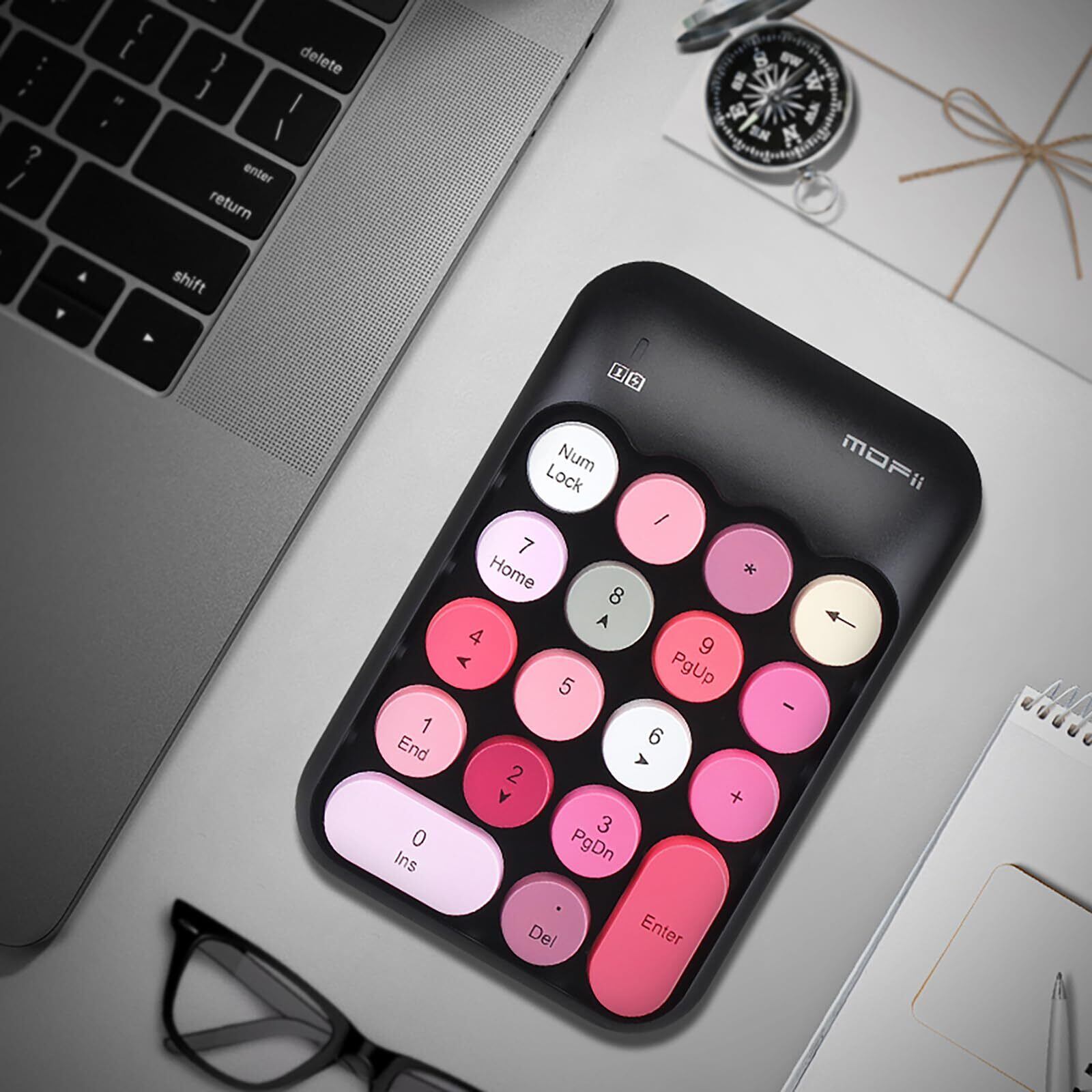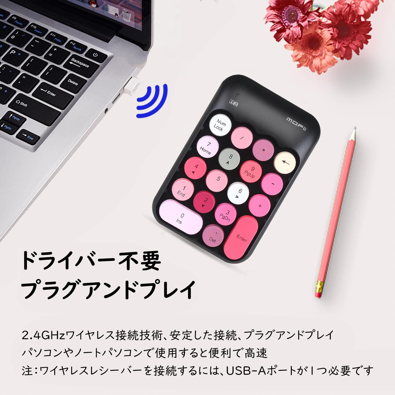 「『可愛い 2.4G ワイヤレステンキー』は、スタイリッシュなデザインと高い機能性を兼ね備えた、特に女性やお子様にぴったりのテンキーボードです!カラフルでおしゃれな外観が特徴で、お使いいただくシーンを華やかに演出します。」
