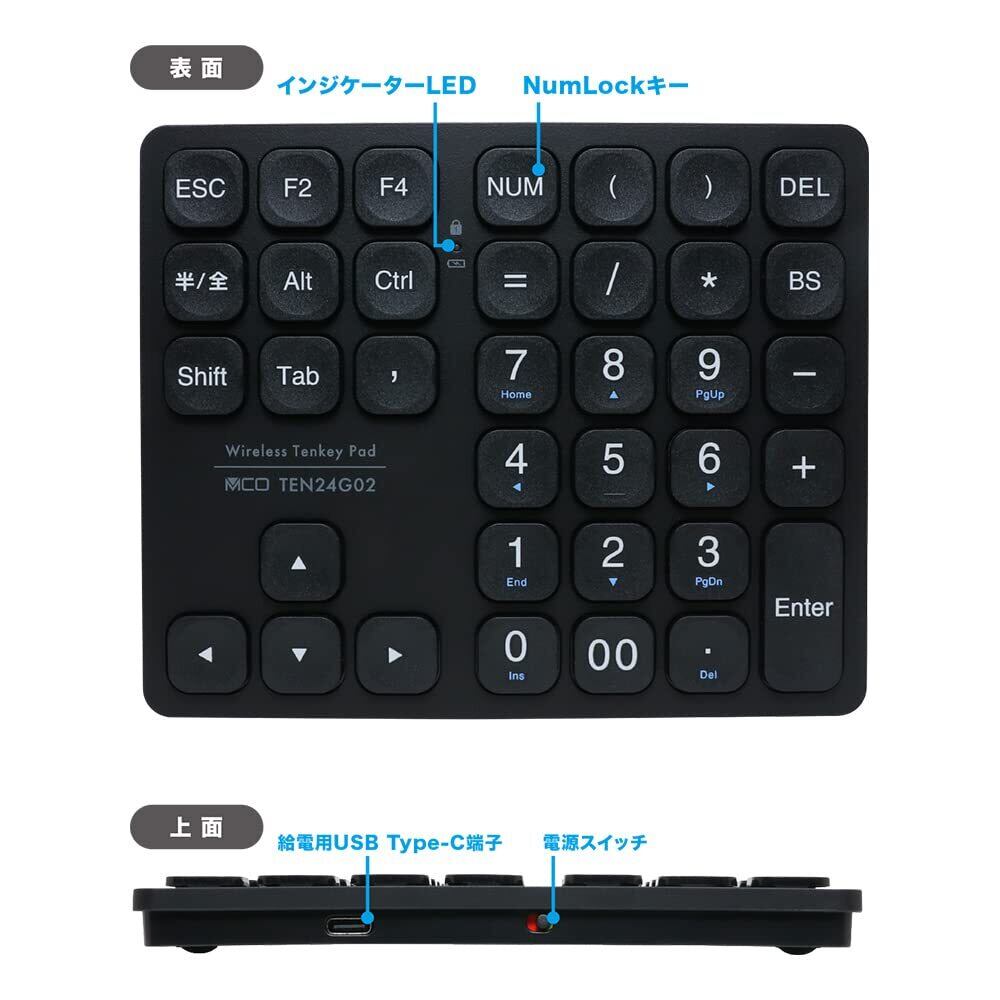 MCO Windows用 テンキー ワイヤレス 方向キー付き 2.4GHz接続 36キー Type-C充電式 最大約75時間可動 充電時間2時間 関数入力に便利な「=」「(」「)」「,」「半角/全角キー」 あると便利な「F2」「F4」「方向キー」を配置 ノートパソコンと同じ浅く軽いタッチで入力 軽量 薄型設計 シルバー ZTEN24G02/S