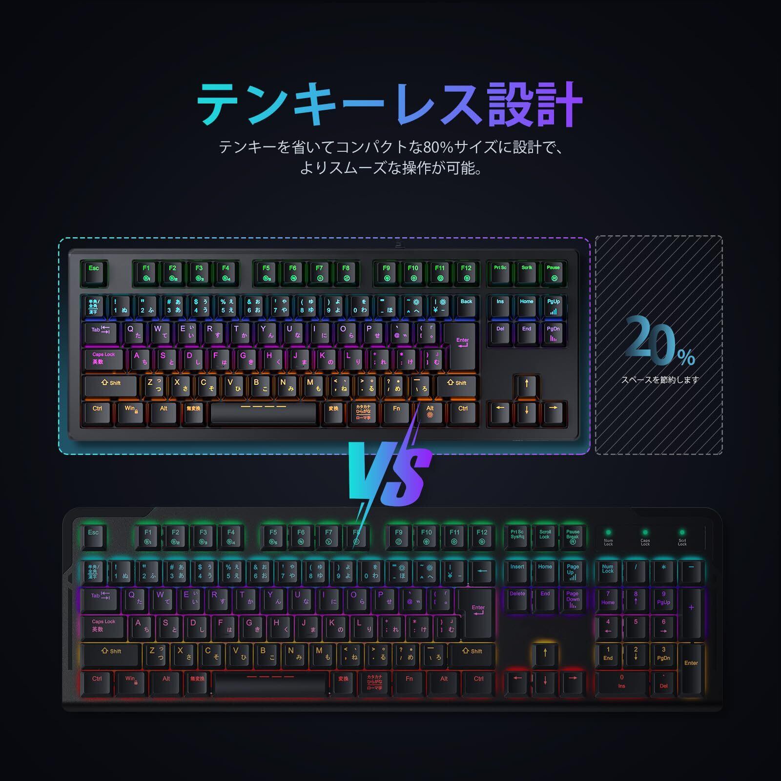 キーボードの説明 JIS配列、80%サイズ、赤軸、マクロ機能、Rainbowバックライト、5000万回のキー寿命