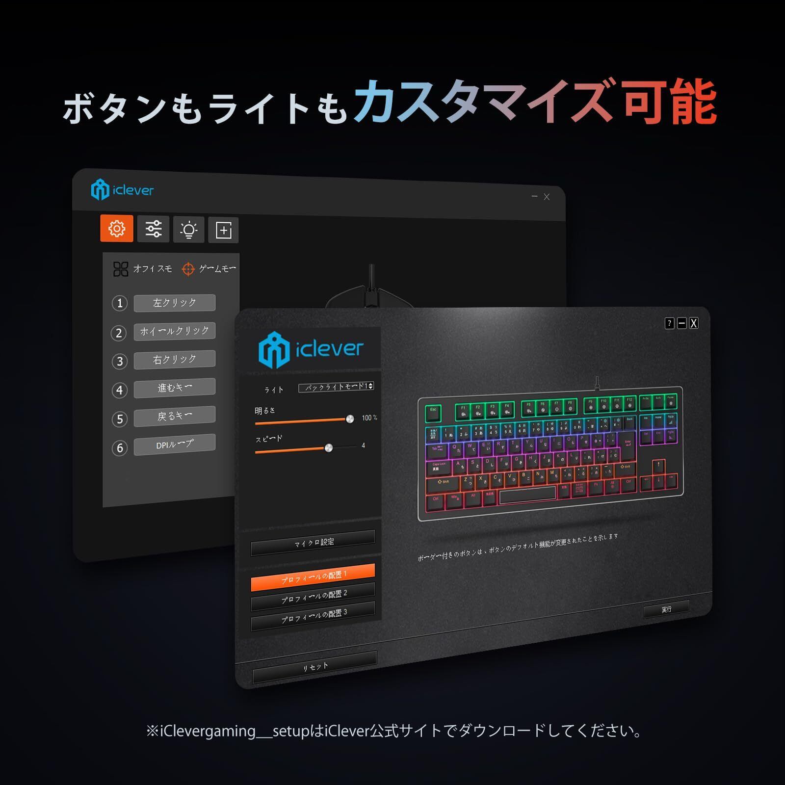 「『iClever ゲーミング キーボード マウスセット』は、ゲームとオフィス両方の用途に対応した革新的なアイテムです!高いカスタマイズ性と多彩なバックライトオプションにより、プレイの楽しさを一層引き立てます。」