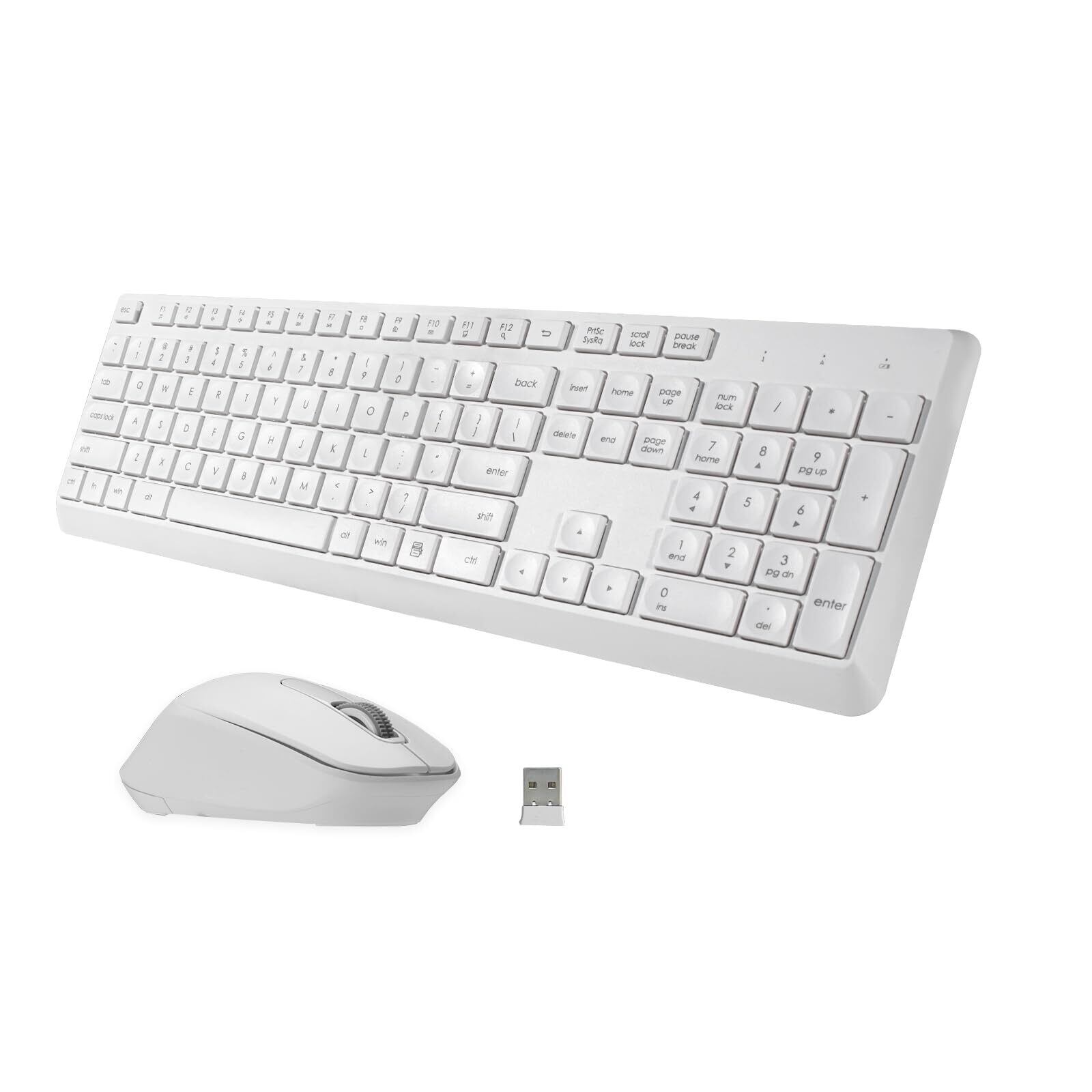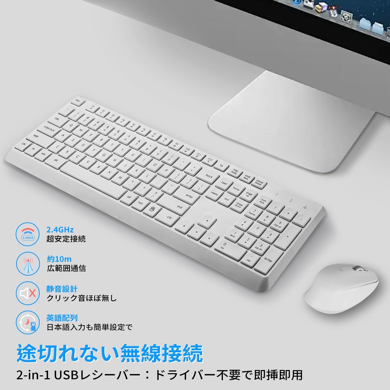 HUO JI ワイヤレスキーボード マウスセット 静音 2.4GHz無線 英語配列 フルサイズ 106キー テンキー付 薄型 英語配列 12個マルチメディアキー 高耐久 省電力 長時間使用 疲れにくい 人間工学 簡単接続 テレワーク/在宅ワークWindows/mac対応 (ホワイト)