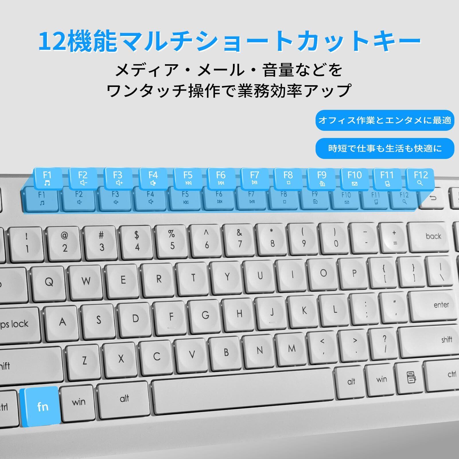【12個のマルチメディアショートカットキー搭載】仕事効率を向上させる 12 個のホットキーを搭載し、メール起動、ブラウザ開啟、音量調整、メディア再生などをワンタッチ操作可能です(※Mac は一部制限あり)。特殊コーティング加工を施したキーは、長期使用でも劣化しにくい耐久性設計です。
