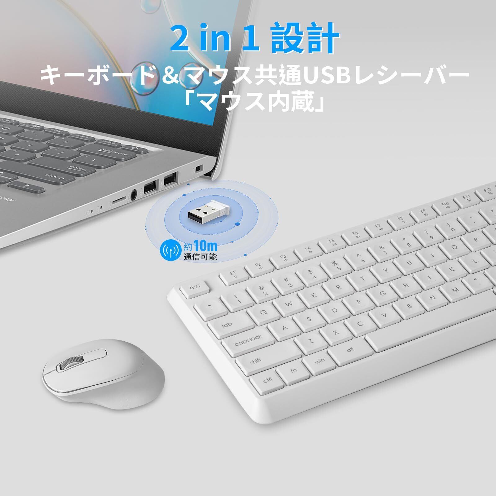 【超安定2.4GHz無線接続&シンプル接続】最新世代の無線チップを搭載して、10m圏内で超低遅延を実現します。たった 1 つの USB レシーバー(マウス内蔵)でキーボードとマウスを同時に接続可能です。ドライバー不要で、Windows/Mac/Chrome OS など、様々な環境ですぐにお使いいただけます。