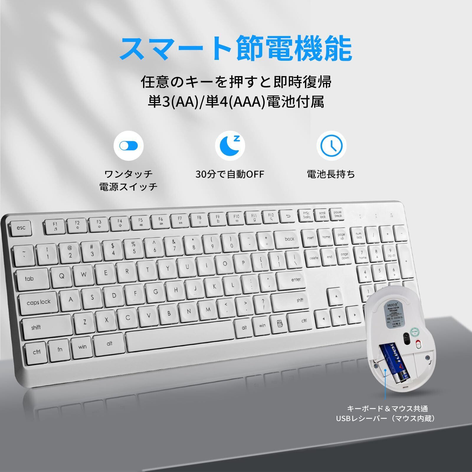 【スマート節電機能&長寿命バッテリー】10分間の無操作時に自動的にスリープモードに移行し、電池消耗を最小限に抑えます。キーボードに単4電池1本、マウスに単3電池1本(付属)を使用して動作し、通常使用時に最大12ヶ月の長期駆動が可能です。
