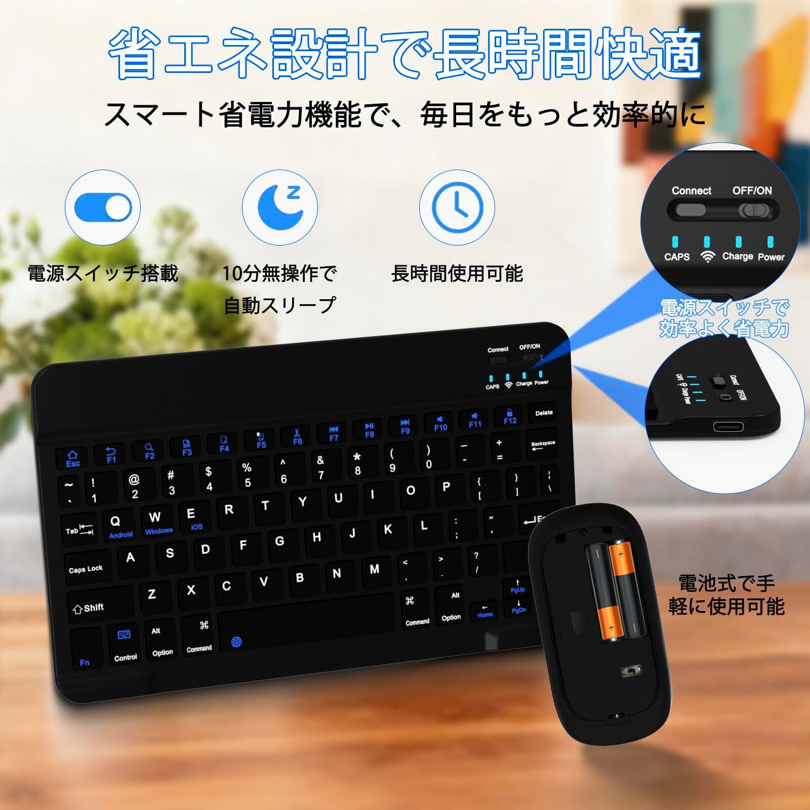 . 【軽量コンパクト&スマート省電力で持ち運びに便利】 キーボードは約170g、マウスは約47gと軽量で薄型のコンパクト設計。バッグにすっきり収納でき、出張やカフェ作業など外出先での使用に最適です。キーボードはUSB充電式で経済的。10分間操作がないと自動でスリープ入る省電力機能搭載で、バッテリー消費を抑えます。