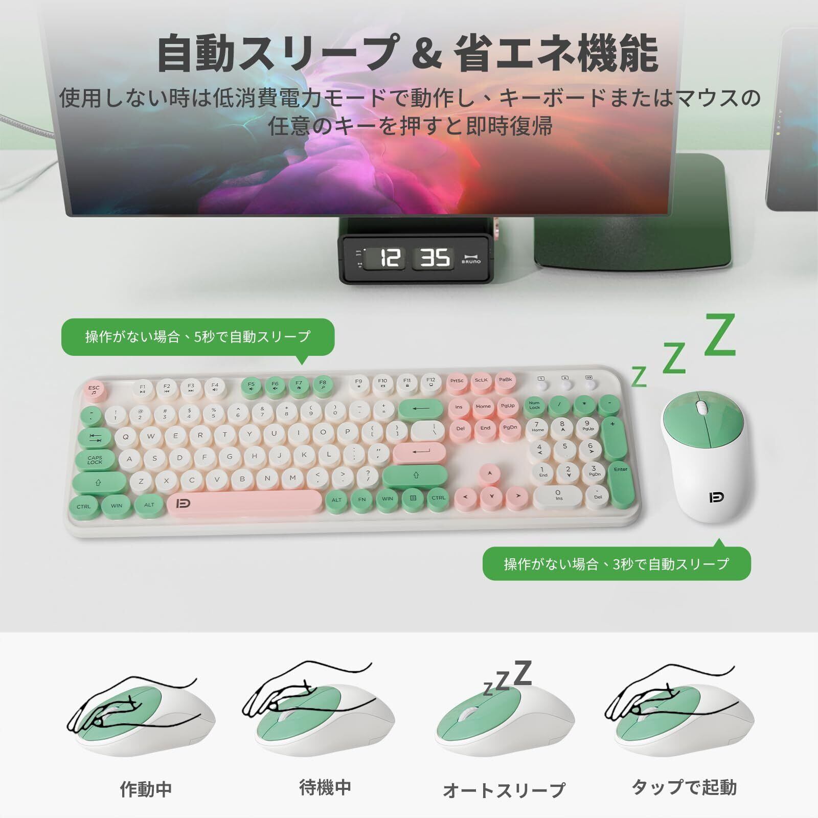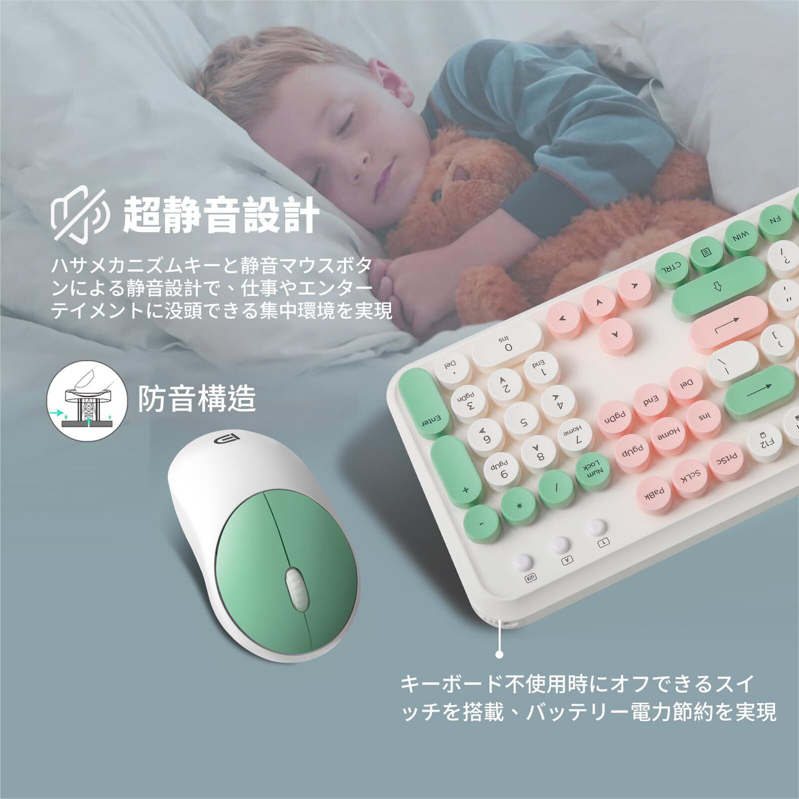 「このキーボードとマウスセットは、2.4GHzの無線接続を採用しており、遅延ゼロでスムーズな操作を実現します。最大10メートルの通信範囲で、自由に動き回りながら作業できるので、机の上もすっきりと整頓できます。」