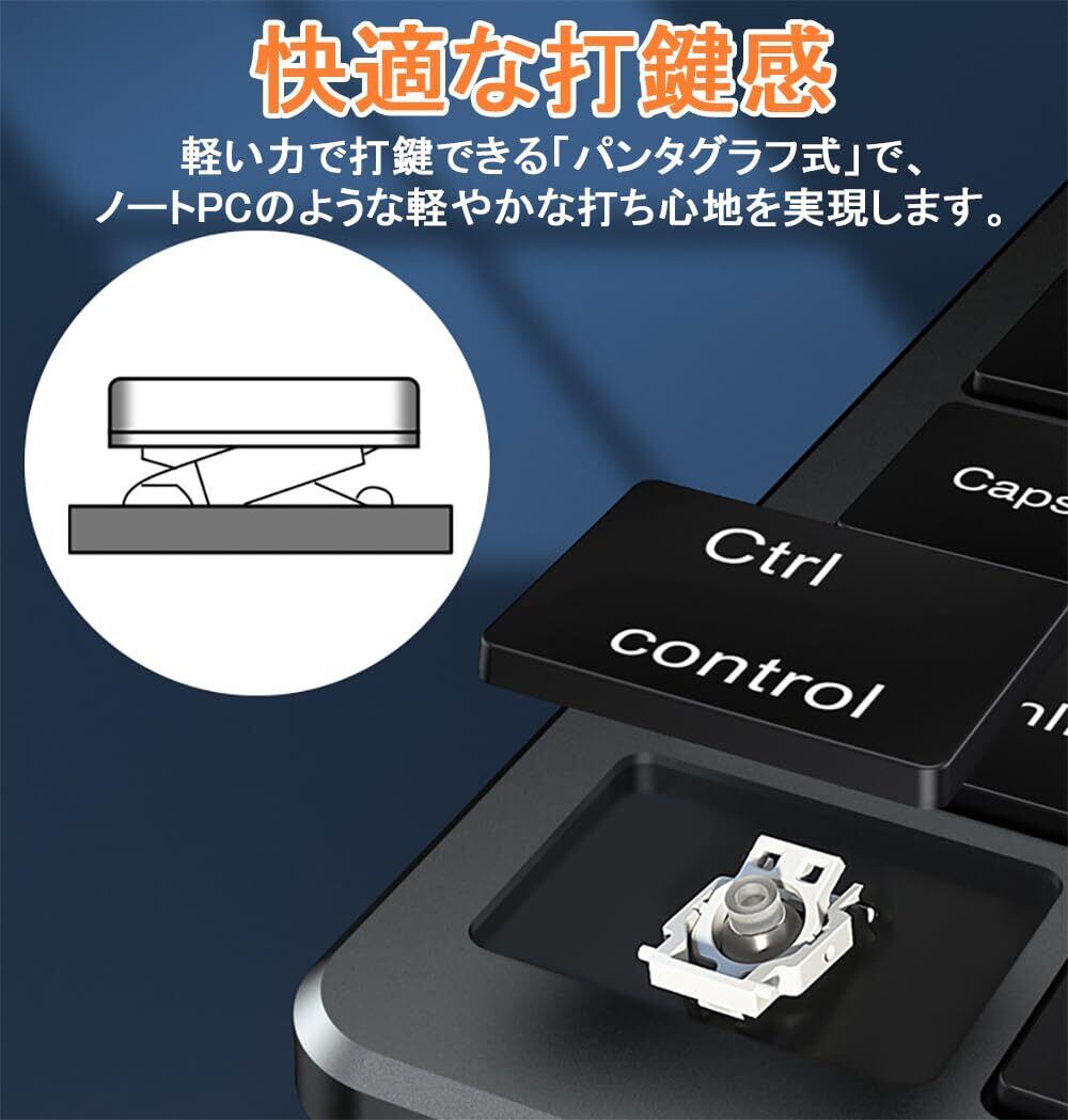 【パンタグラフキーボード、静音マウス】ブルートゥースキーボードはノートPCと同じ「パンタグラフ式」を採用して、快適な打鍵感で、人間工学に基づいて設計された傾斜角度により、キーボードは私たちのタイピング習慣にぴったりと合い、長時間タイピングしても疲れません。 マウスの左右ボタン、ホイールともに完全無音化されており、職場や図書館などで使用しても全く人の邪魔にならない。
