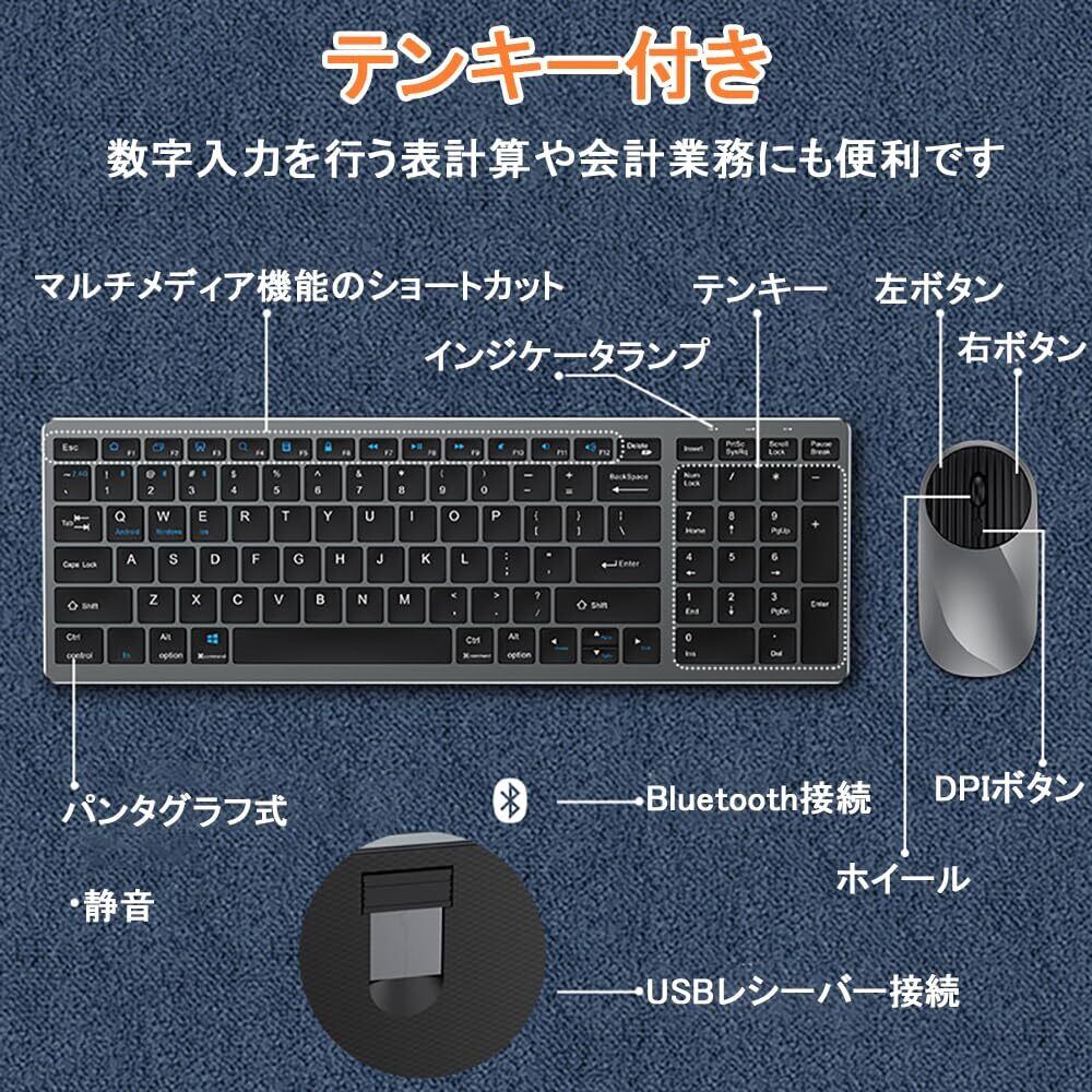 【マルチ接続・2.4GHz&BLuetooth5.0】ワイヤレスキーボードマウスセット 無線 マルチペアリング 4台まで同時 テンキー付き フルサイズ 静音 充電式 US配列 ブルートゥース スマホ、タブレット、パソコン用