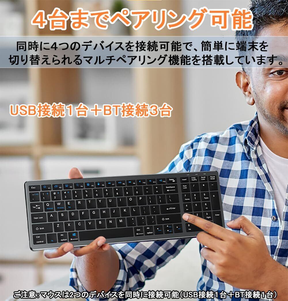 **【マルチ接続・2.4GHz&Bluetooth5.0】ワイヤレスキーボードマウスセット 無線 マルチペアリング 4台まで同時 テンキー付き フルサイズ 静音 充電式 US配列 ブルートゥース スマホ、タブレット、パソコン用**