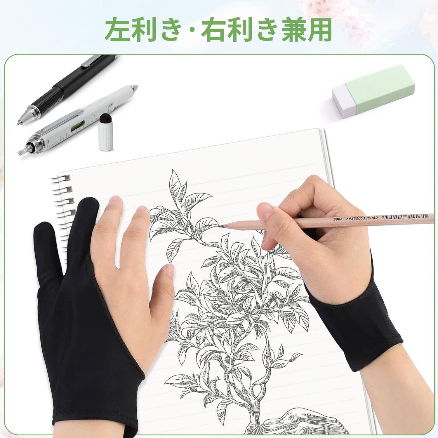 【誤動作防止機能】グローブの画面接触部分にパッドがついているので、絵を描くときに画面に接触した手による誤操作を防止二本指グローブです。手と液タブ、ペンタブレット接触面の摩擦を減らし、スムーズな描画が可能になります