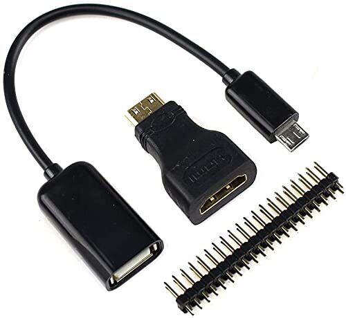 パッケージに含まれるもの: アクリルケース、電源、ヒートシンク、Micro USB to 4ポートUSB OTG、スイッチケーブル、OTGケーブル、HDMIアダプター、GPIOヘッダー、およびドライバー。