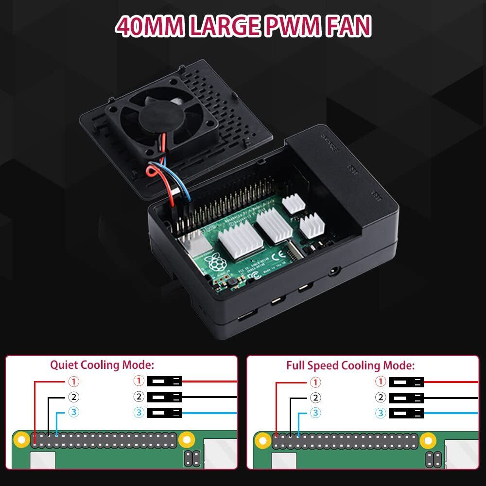 このRaspberry Pi 4Bケースには、Raspberry Pi 4Bの放熱性を高めるために、超静音の40mm PWMファンと4個のヒートシンクが含まれています。