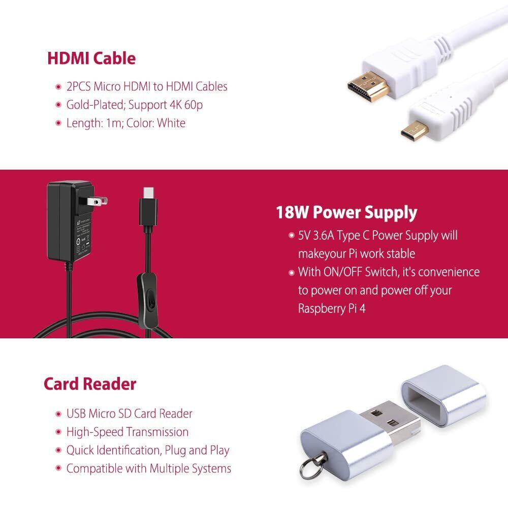 パッケージ内容: Raspberry Pi 4B (8GB RAM) x 1、Raspberry Pi 4B ケース x 1、冷却ファン x 1、アルミニウム ヒートシンク x 4、5V 3.6A 電源 x 1、128GB SD カード x 1 (カード リーダー付き)、4K HDMI ケーブル x 2