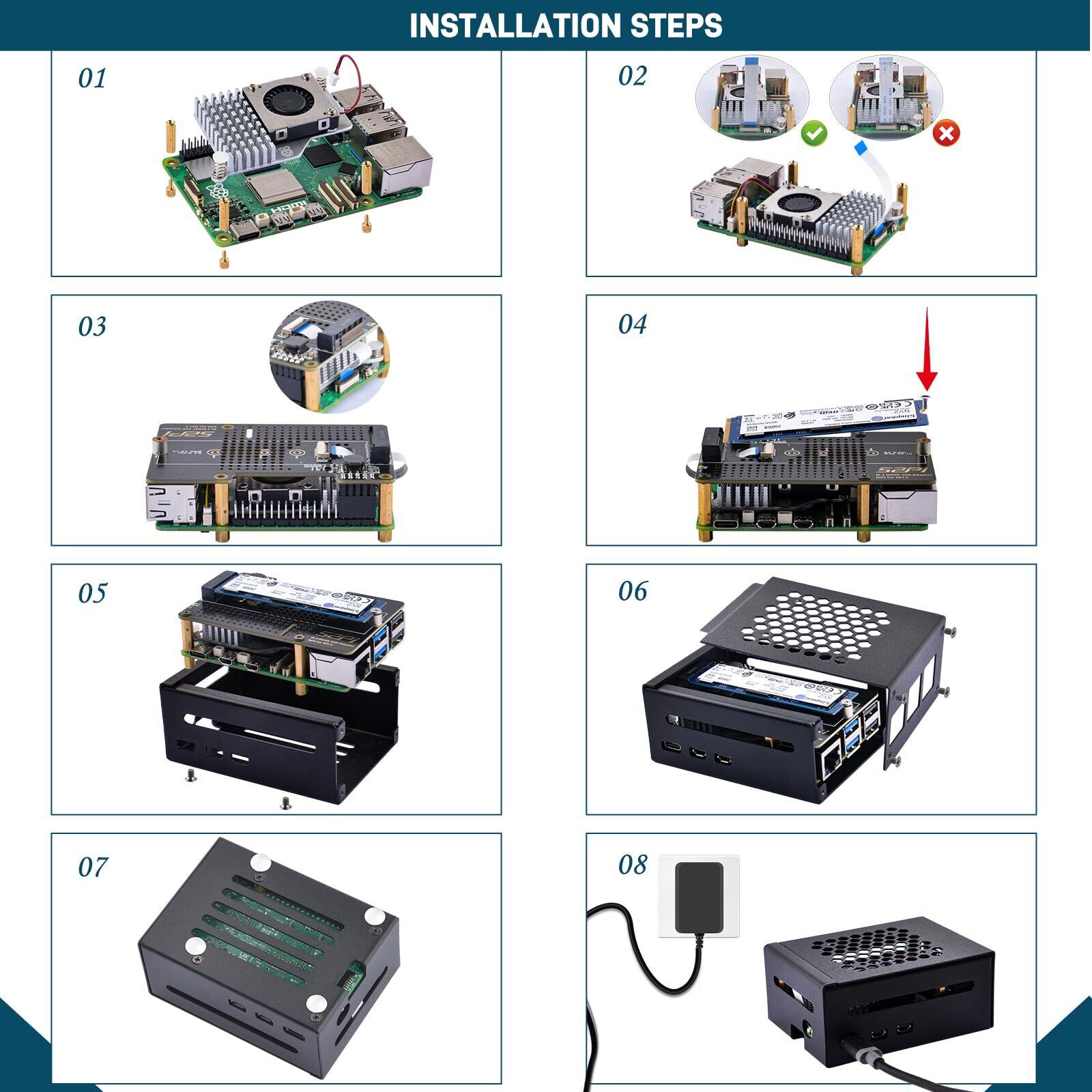 【N04 M.2 NVMe to PCIeアダプター付属】N04 M.2 NVMe から PCIe へのアダプターは、最新の Raspberry Pi 5 用に設計されています。M.2 フォーマット サイズ 2230、2242、2260、2280 の NVMe (M キー) ドライブのインストールをサポートします。追加のカスタム CNC SSD マウント ネジ、はんだ付けは不要。