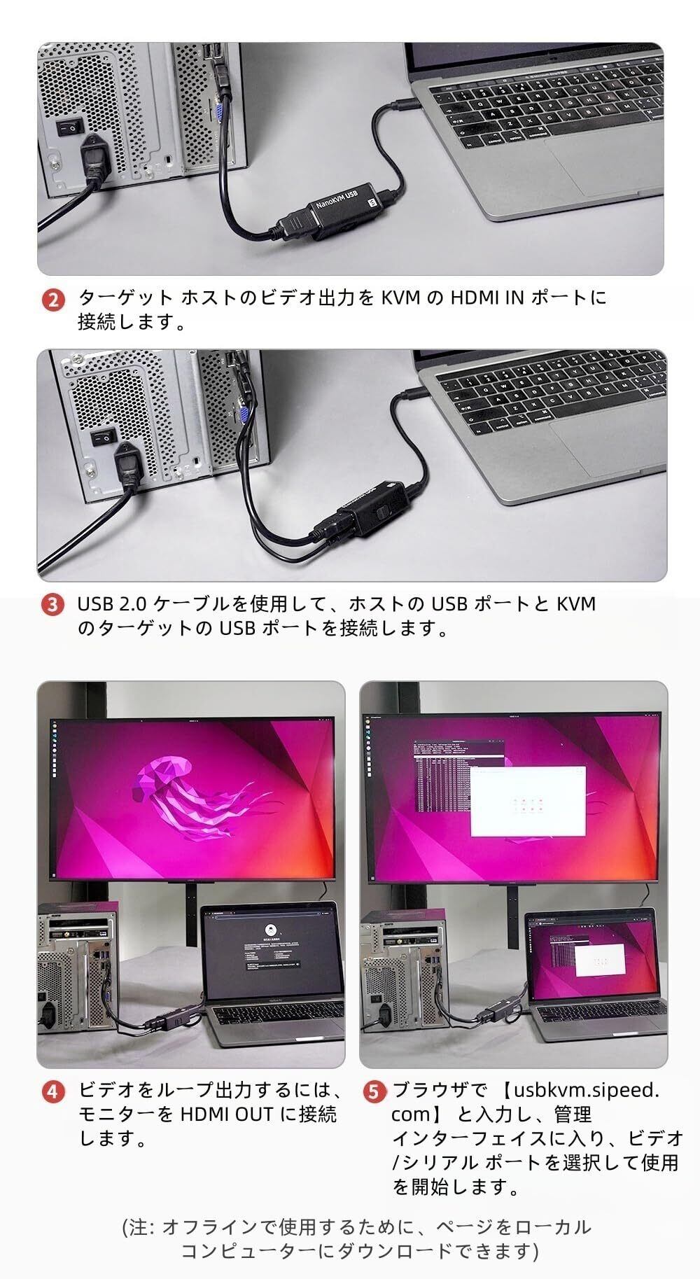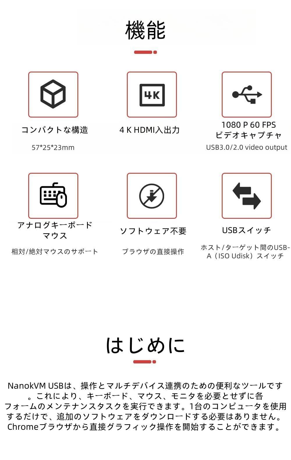 NanoKVM-USB は、操作や複数デバイスのコラボレーションに便利なツールです。キーボード、マウス、モニターを必要とせずにメンテナンス作業を実行できます。1 台のコンピューターのみを使用し、追加のソフトウェアをダウンロードすることなく、Chrome ブラウザーから直接グラフィカル操作を開始できます。