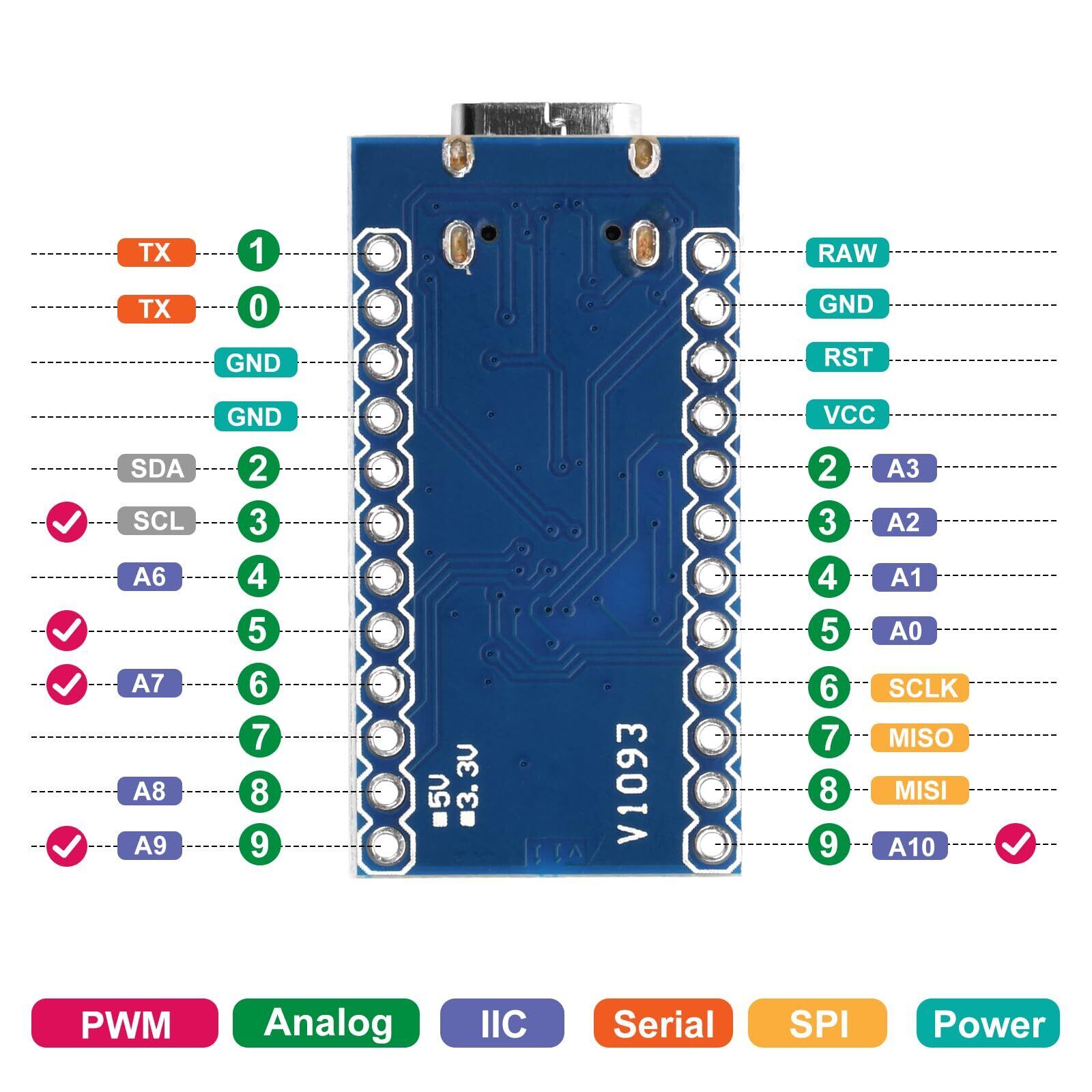 豊富なI/Oインターフェース:9つのデジタルI/Oピン(5つはPWM出力対応)と4つのアナログ入力ピンを提供し、UART、I2C、SPIなどの通信プロトコルをサポートしており、プロジェクトの拡張性が高まります
