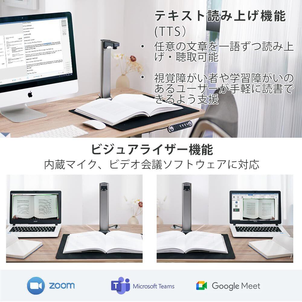 「自動平坦化機能により、ページの歪みや傾きを補正し、いつでもクリアな画質を提供します!本体にLEDライトを搭載しており、暗い場所でも均等な照明でスキャンが可能です。書画カメラとしても利用でき、オンライン授業やプレゼンテーションで活躍します。」