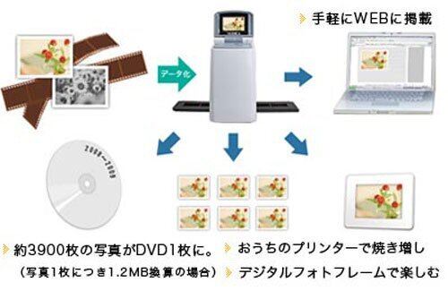 お気に入りのフィルムがパソコン不要、ワンタッチでデジタルデータとして蘇る、500万画素のCMOSイメージセンサーを採用し、解像度1800dpi(最大3600dpi画像補完)のスキャニングを実現。35mmフィルム(6コマ)用と映写機や写真鑑賞に使うスライド(マウント用)の二種類のホルダーを用意。SDカードへダイレクトにデータ保存が可能なためPC接続不要。液晶モニタを搭載、保存した画像の確認が簡単
