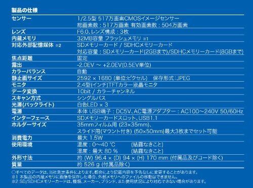 500万画素のCMOS イメージセンサーを採用し、解像度1800dpi(最大3600dpi 画像補完)のスキャニングを実現。35?フィルム(6コマ)用と映写機や写真鑑賞に使うスライド(マウント用)の二種類のホルダーを用意。SD カードへダイレクトにデータ保存が可能なためPC 接続不要。液晶モニタを搭載しており、保存した画像の確認が簡単。ボタン1つの操作で誰でも簡単にネガ・ポジをデジタルデータに保存が可能。SDメモリーカード(2GBまで)と、SDHCメモリーカード(8GBまで)に対応し、保存形式は汎用性の高いJPEG方式を採用。