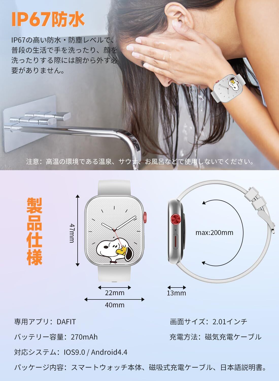 【 適応機種 &IP67防水 &パッケージ内容 &多言語対応】IP67の防水性を備えているので、日常生活の手洗いや洗顔の際はもちろん、汗だくのトレーニングにも気にせずに使用できます。 パッケージ内容:スマートウォッチ本体1、専用充電ケーブル1、日本語取扱説明書*1。Android 6.0/iOS 10.0以上、Bluetooth5.0以上対応のスマートフォンに適応しています。 日本語、中国語、英語など23カ国語以上が収録されており、専用アプリ「DAFIT」で必要な言語を設定することができます。