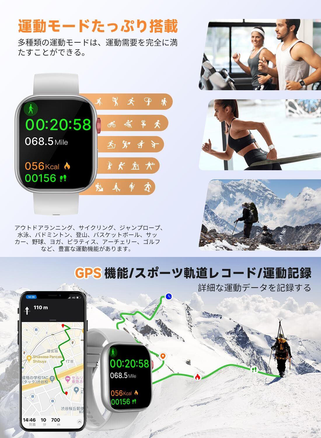 「多様な運動モードを搭載し、ウォーキングやランニング、さらにはヨガまで、さまざまなアクティビティを記録。心拍数やカロリーの計測を行い、専用アプリでデータを分析することで、健康的なライフスタイルをサポートします。」