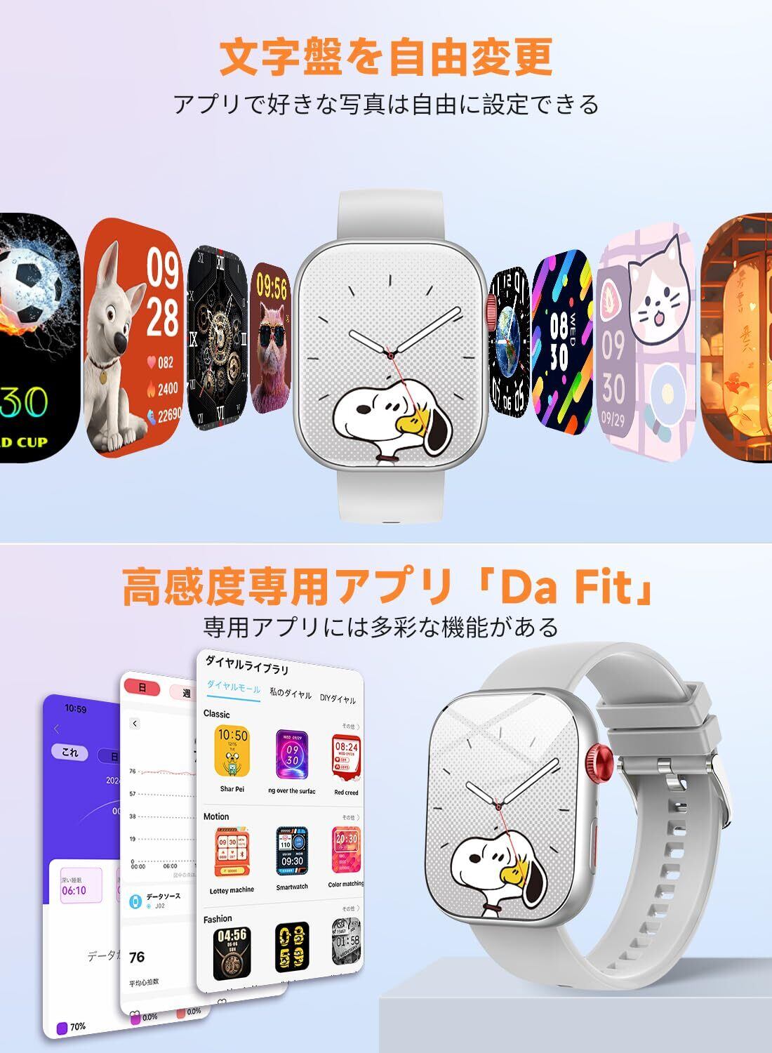 【2.01インチHD大画面 & DIY文字盤】Smart Watchは、2.01インチ大画面でより高い解像度の視覚体験とスムーズなタッチ触感を楽しめ、通知や文字一目で見やすくなる!文字盤は、本体からプリセットされている文字盤を選択する以外に、専用アプリ「DAFIT」100種類以上の文字盤をダウンロードできます。スマートフォン上の写真を選択して文字盤をカスタマイズしたりできます。さらに、文字盤DIY機能もあり、自分の好みに合わせて交換可能できます。加え、バンドは交換可能なので、標準の22mm幅バンドを自分の好みに合わせて交換可能できます。