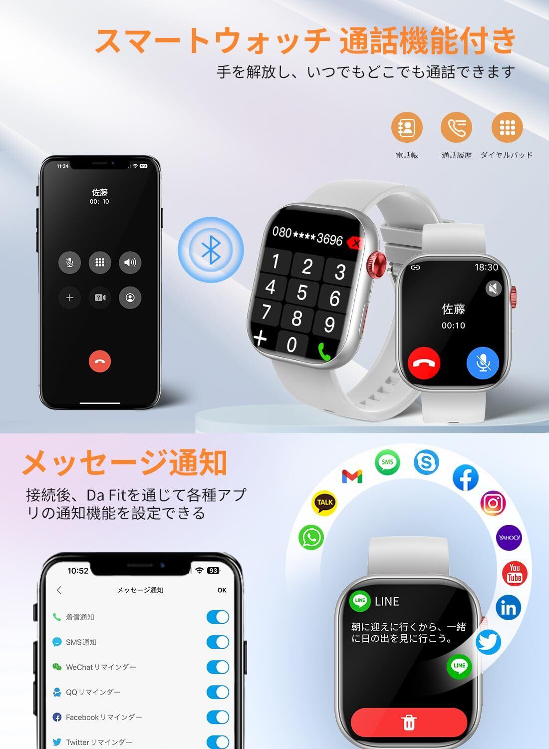 【最先端のBluetooth5.3搭載·通話/メッセージ通知 & 通話機能付き&Lineメッセージ通知&便利な機能満載】スマートフォンと接続すれば、スマートウォッチから直接電話をかけたり、応答したりできる、通話履歴の保存や連絡先を確認も可能です。歩数計、天気予報、アラーム、データ同期、時計機能はもちろん、通話機能、遠隔カメラ、座り過ぎ注意、音声アシスタント、スマホ探し、SOS機能、電卓、懐中電灯、音楽制御/再生 など機能もあります。