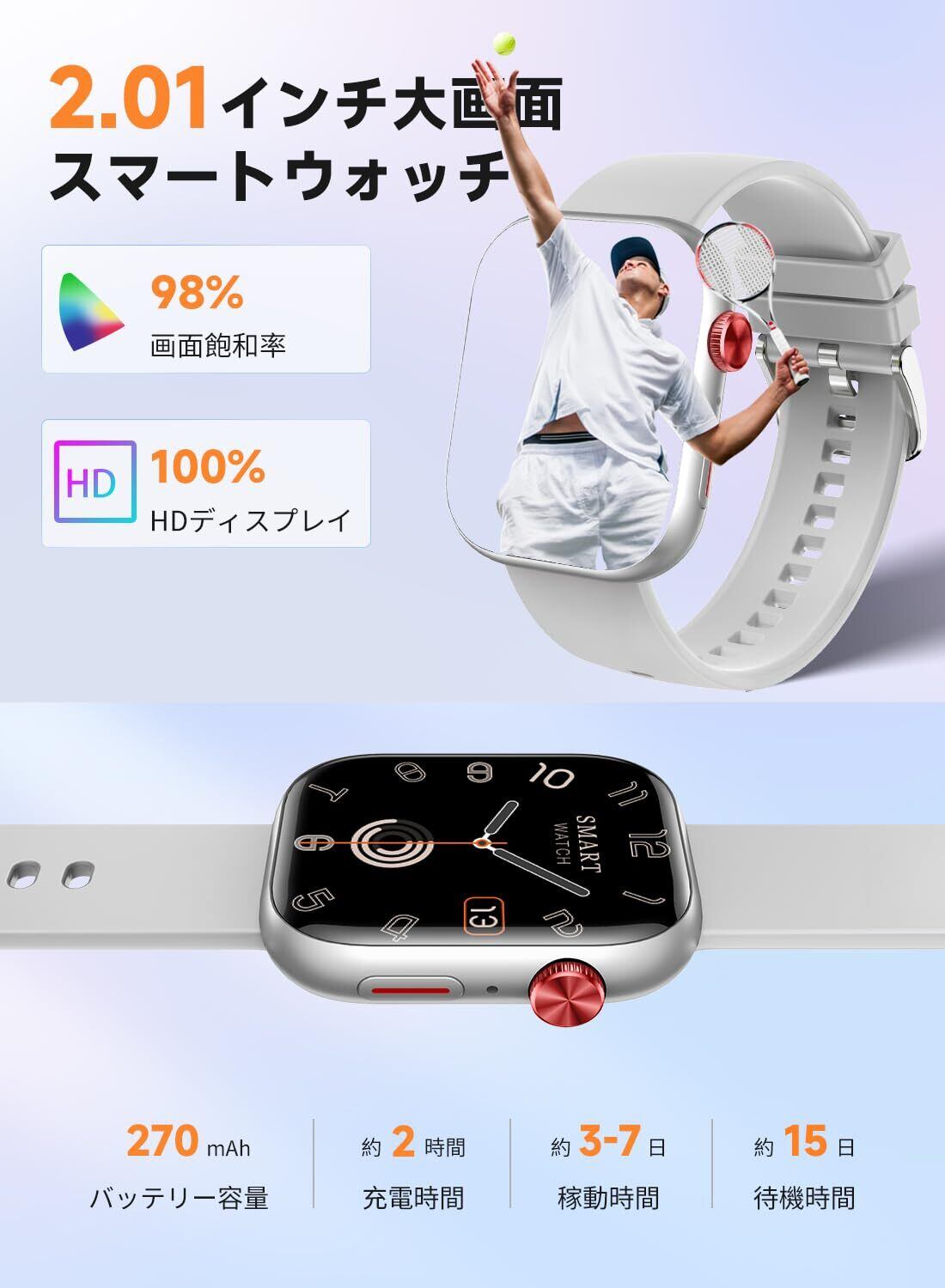 「2.01インチの大画面は、視認性に優れ、重要な通知も一目で確認可能です。シンプルで洗練されたデザインは、どんなファッションにも合わせやすく、ビジネスシーンでもカジュアルでも活躍します。」