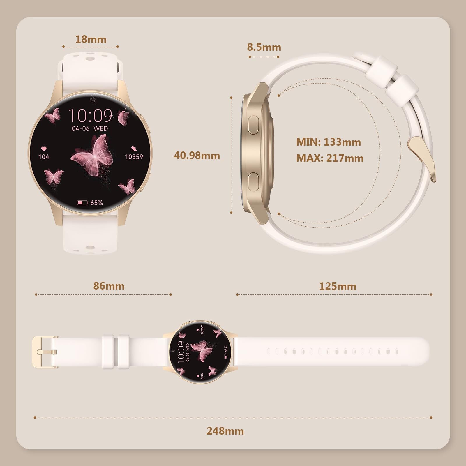 女性向けBluetoothスマートウォッチ。1.27インチTFTタッチスクリーン(360x360ピクセル)、パーソナライズされたウォッチフェイスデザイン。24時間心拍数、睡眠モニター、歩数計、水分補給リマインダーといった基本的な健康機能を搭載。280mAhバッテリー、マグネット充電、2.5時間でフル充電。IP68防水規格。使いやすく、プラグアンドプレイ。Android 5.0 / iOS 8.0以上に対応。便利なデイリーアシスタント、着信通知、天気アプリ、目覚まし時計、Bluetoothによるスマホ探し機能も搭載。