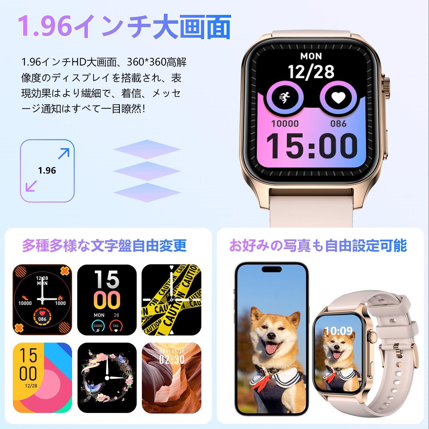 「この『スマートウォッチ』は、1.96インチの大画面を搭載し、最新のBluetooth 5.4技術を活かした通話機能や音楽再生機能を実現した、革新的なデバイスです。iPhoneやAndroidに対応しており、日常的な健康管理と瞬時の通知確認を可能にします。アクティブライフにぴったりな170種類以上の運動モードも収録、あらゆるシーンであなたをサポートします。」
